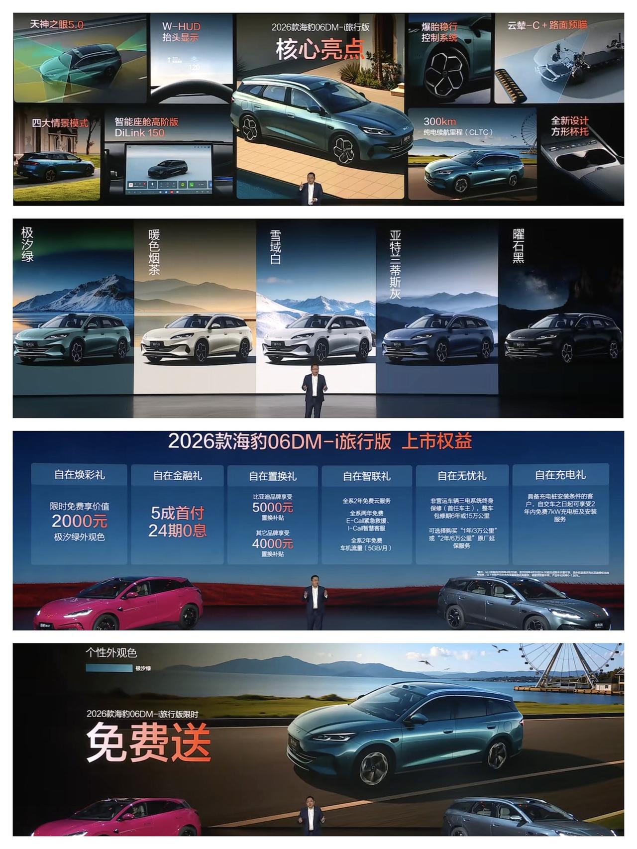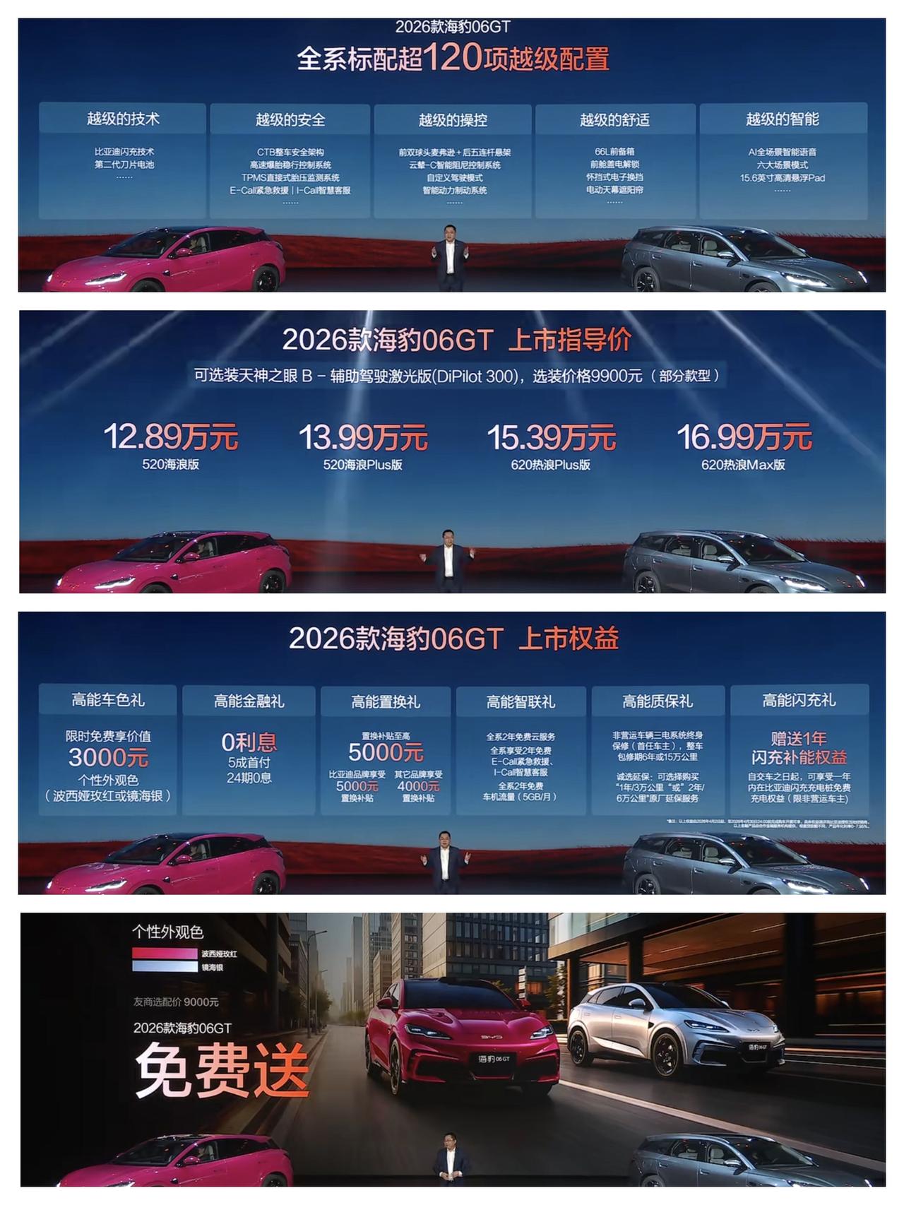 2026款比亚迪海豹06 DM-i旅行版,售价11.19万元至13.99万元。入门配备200km纯电续航,顶配配备300km纯电续航,可以选装天神之眼B激光雷达。 配置:全新标配前排电动座椅、标配电动尾门。次低配标配天神之眼C,200尊享型以上标配座椅通风加热。配置还是不错的,对比上一代电池升级,配置有升有降。 2026款比亚迪海豹06 GT,售价12.89万元至16.99万元,顶配有天神之眼B激光雷达,部分配置可以选装激光雷达。入门版有定速巡航和15.6英寸大屏,有云辇C和第二代刀片电池以及闪充技术。 次低配开始标配天神之眼C辅助驾驶,顶配版标配天神之眼B辅助驾驶,全系配置都很不错,个人觉得中高配和顶配非常合适。该有的配置全都有了。