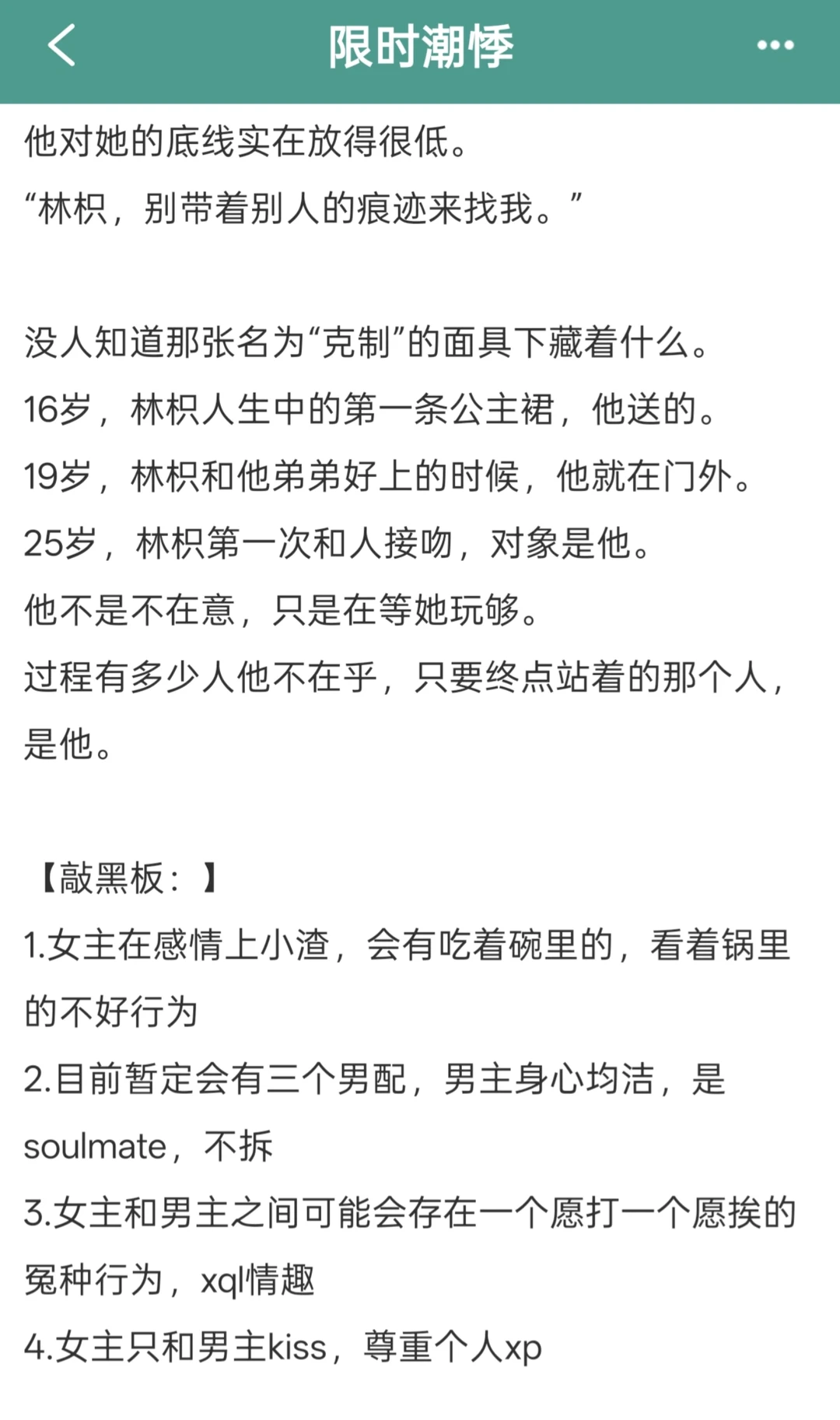 这本真的巨巨巨香啊,男女主青梅竹马,没有人比男主更了解女主。所以他一直在等女主玩够。他可以等,但绝不要成为她的前男友之一。就这样默默把自己藏到了蕞后,再献给女主