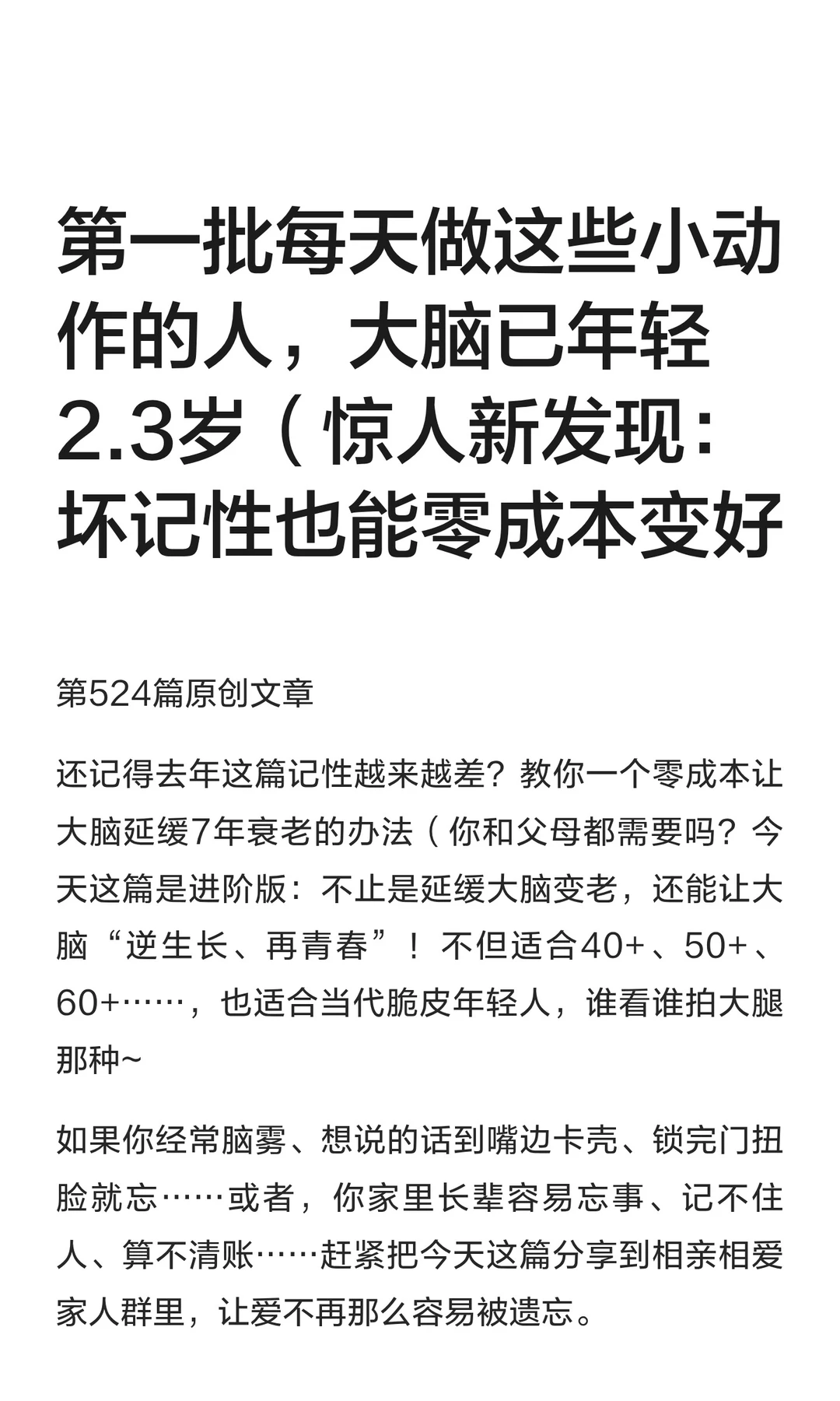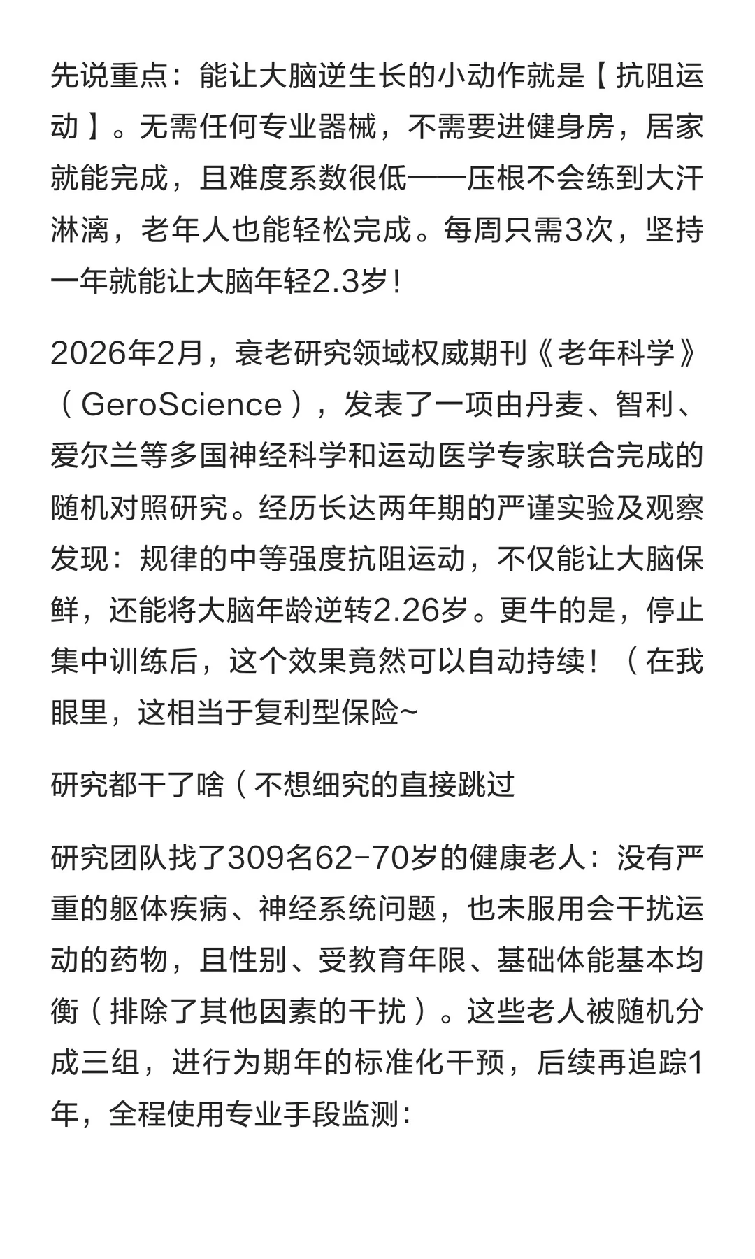 每天3个小动作,就让大脑年轻2.3岁!真有那么厉害吗?🤔 一项发表在国际权威期刊《老年科学》的研究证实:每周坚持3次中等强度抗阻运动,一年后大脑年龄可年轻2.3岁,且效果持续! 靠墙静蹲、垫脚......这些运动不用去健身房,居家就能练,还在等什么?赶紧纳入你的锻炼计划,我们一起唤醒大脑活力吧>>>>