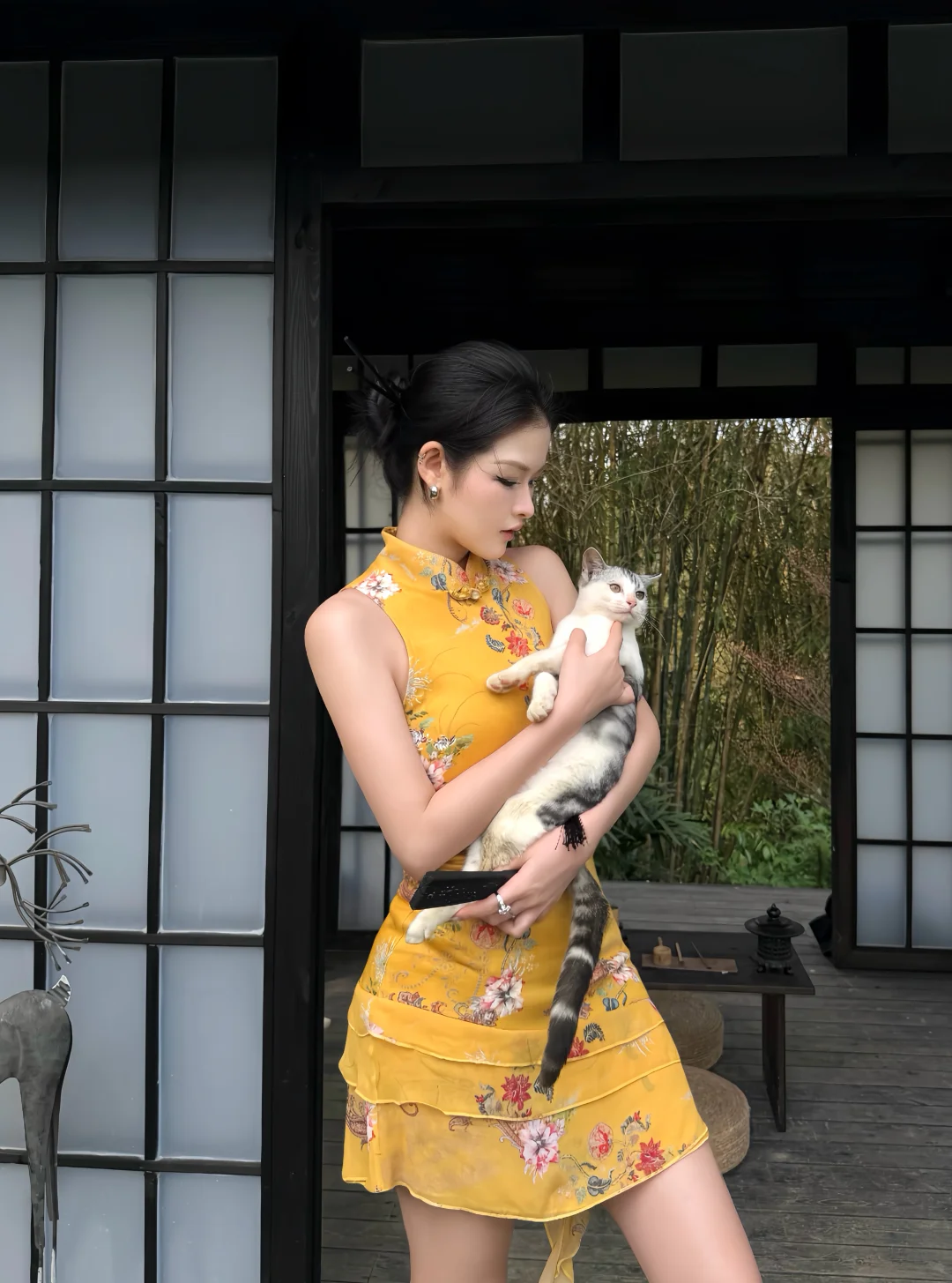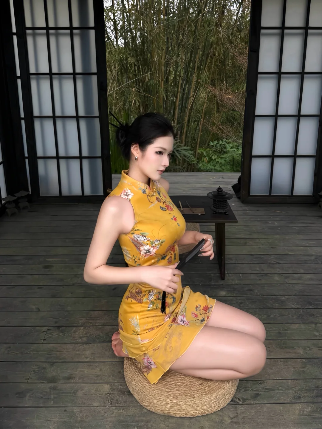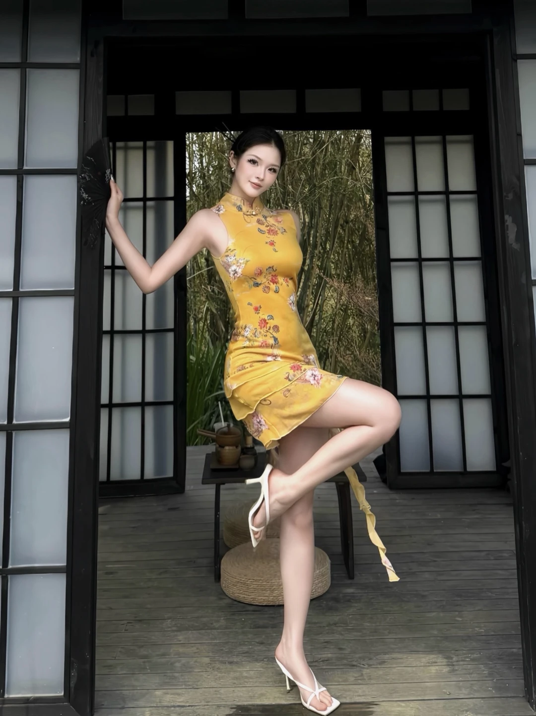 竖条纹旗袍的开叉恰到好处,衬得腿型修长,线条舒展而柔和;肤色均匀且细腻,姿态优雅