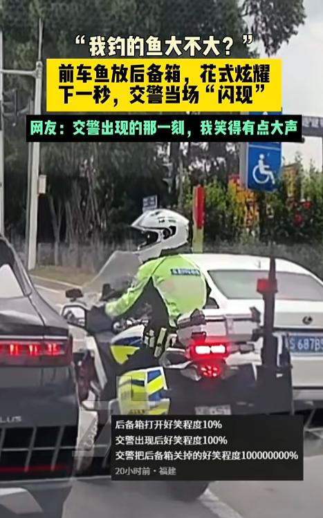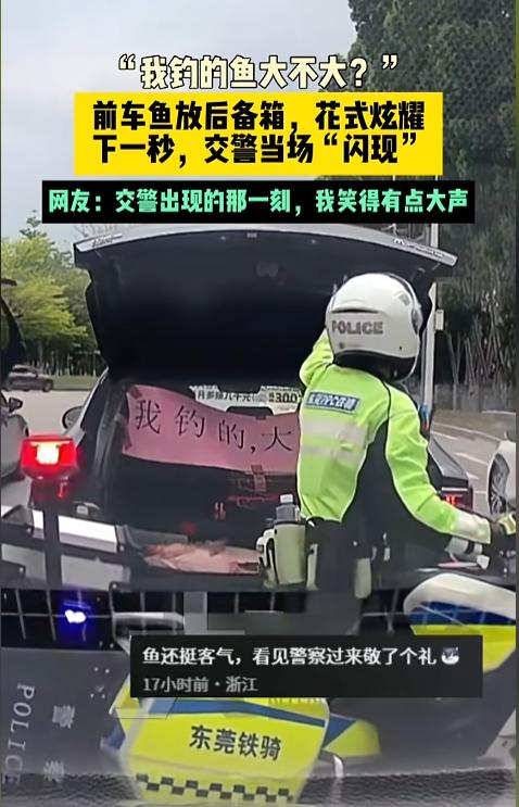 “笑不活了!”近日,广东东莞,一位司机正在路上行驶,正好前方红灯了。前车突然打开了后备箱,里面放着一条大鱼,还有一张大字横幅,写着“我钓的,大不大”。这时候,一名交警骑摩托横插到了车后。交警:就问你怕不怕! 钓到大鱼可是一件大喜事,不少人会刻意的到处嘚瑟,又是背着鱼走的,又是带着鱼四处溜圈的,生怕旁人看不见。不过,在路上显摆,可一定要注意安全,遵守交通规则。 这位车主钓鱼获得了大丰收,一条大鱼被它擒获,长度跟自己车后备门差不多宽。这一下可把他高兴坏了,说什么也得好好炫耀炫耀。 他把鱼放进了后备箱里,又在里面挂上了条横幅,一到路口停车的时候,就打开后备箱,这样,后面的车就能看见自己的收获,也没有多危险。 事发时,前面正好是红绿灯,他把车停稳后,又打开了后备箱。没想到,这次等来了一位新观众。一名交警骑着摩托车,闪现到了他的车后面,还贴心的帮忙关上了后备箱。这些做完,交警直接就来到了司机的面前。 网友看后表示,被当场抓包,这也太好笑了,看司机以后还敢不敢嘚瑟了!开车不关后备箱是一件很危险的事,而且还是违法的哦,大家可千万不要模仿! 信息来源:《近日 广东东莞 “我钓的鱼大不大?”前车鱼放后备箱,花式炫耀,下一秒,交警当场“闪现”。网友:交警出现的那一刻,我笑得有点大声》大参考