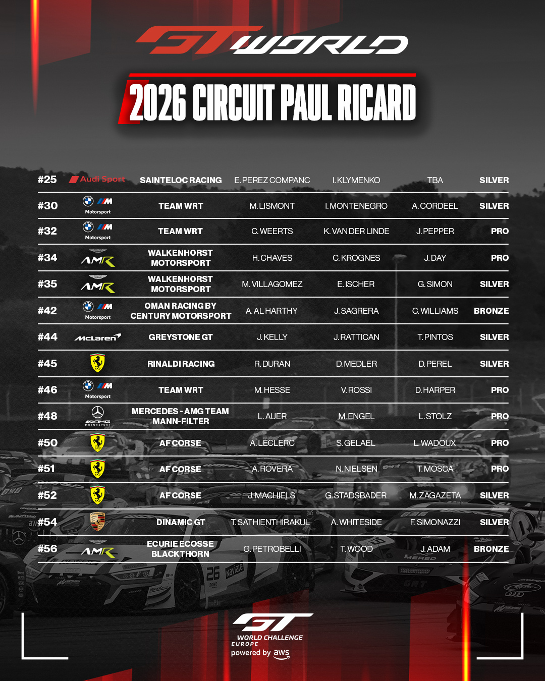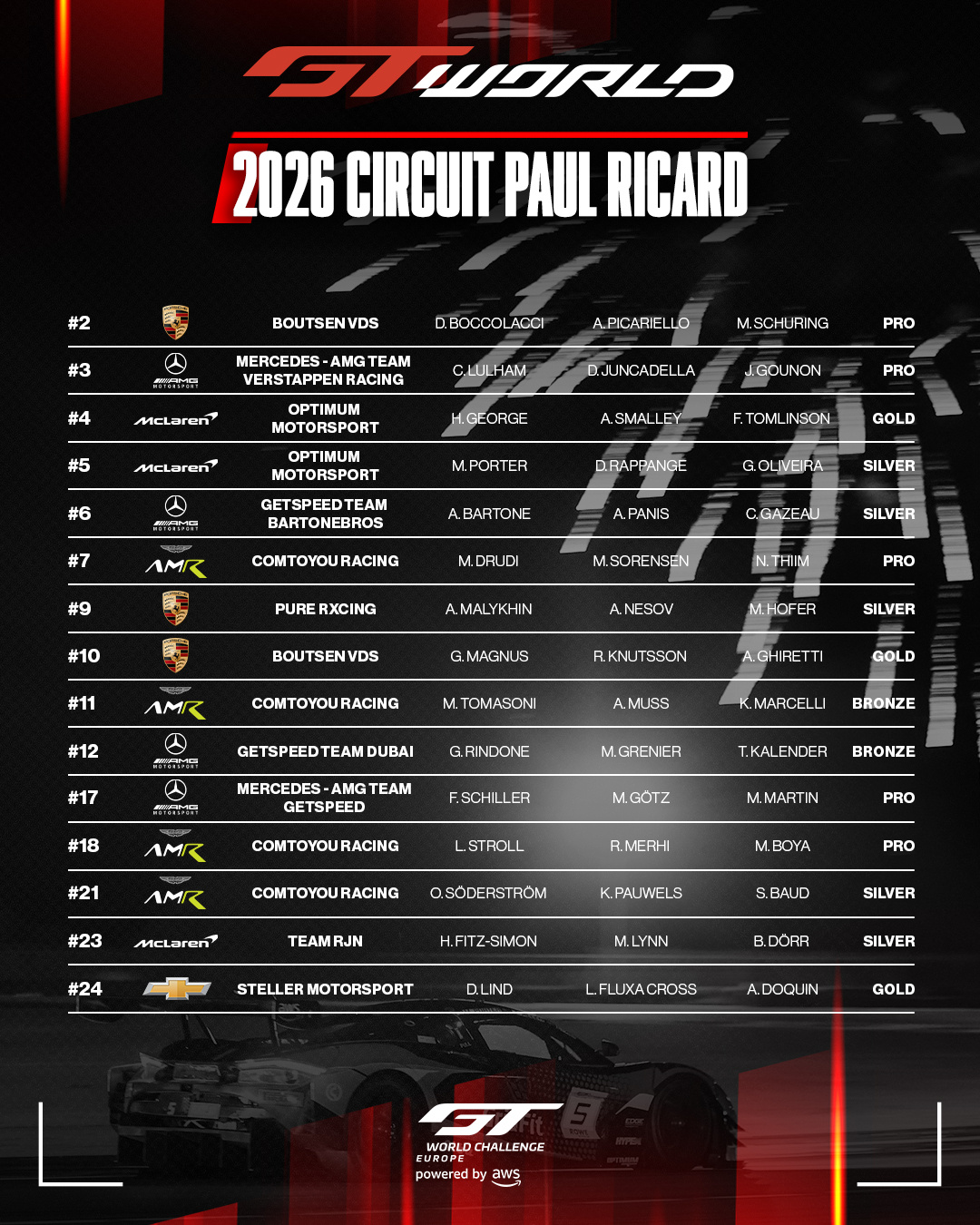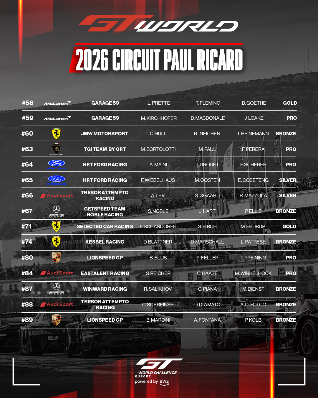 全场59台赛车,其中18台Pro车,这也是竞争最激烈的GT赛事