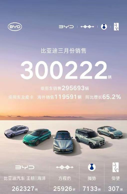 比亚迪3月卖了30万辆,这个成绩咋样?刚出炉的3月数据,比亚迪销量300222