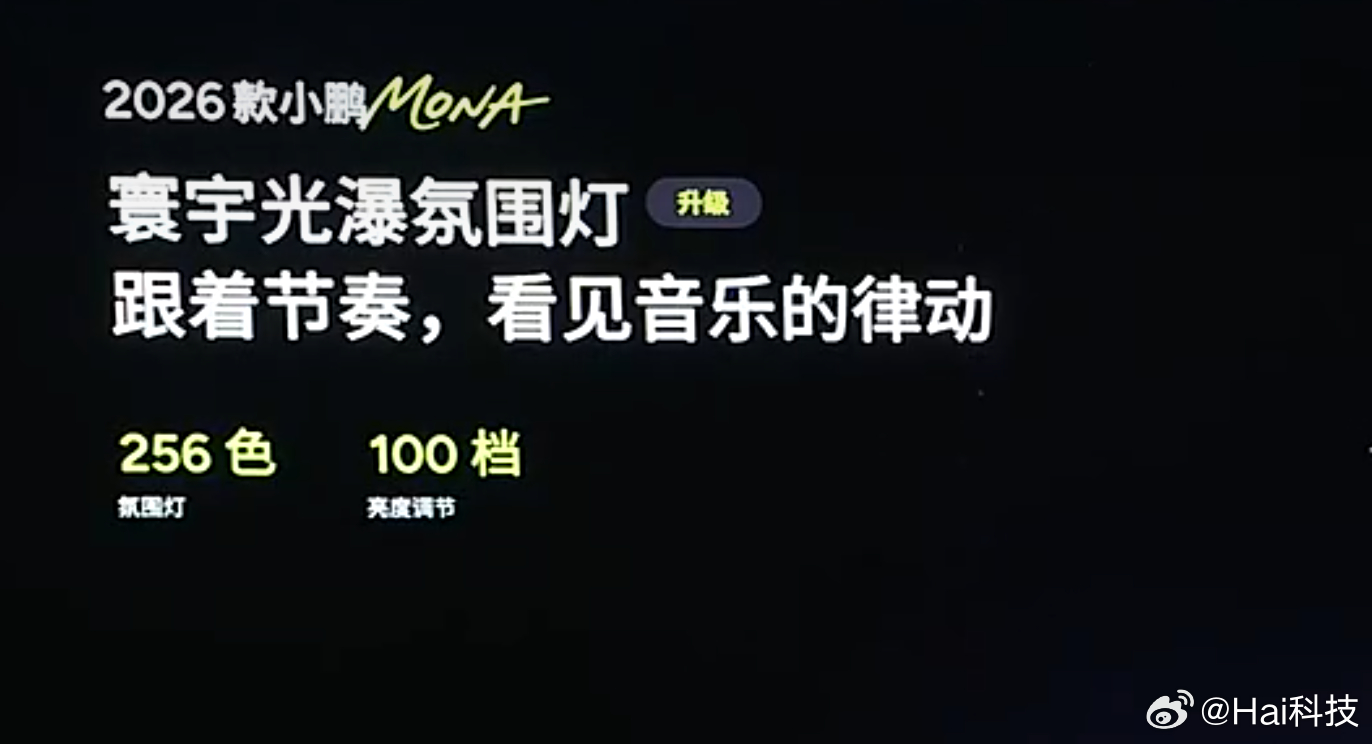 除了新增三款外观色、内饰色,26款小鹏Mona M03升级20扬声器,双层静音前门玻璃+RNC主动降噪模块,高速行驶噪声比特斯拉Model3还要低。256色氛围灯、热泵空调,续航高至640KM,10.8度/百公里;自适应阻尼减振器、15项主动安全配置安排2026款小鹏MONA今日上市2026款小鹏MONA大大大大大升级