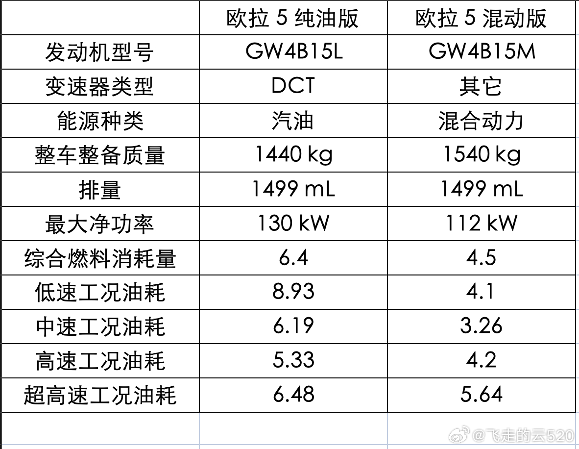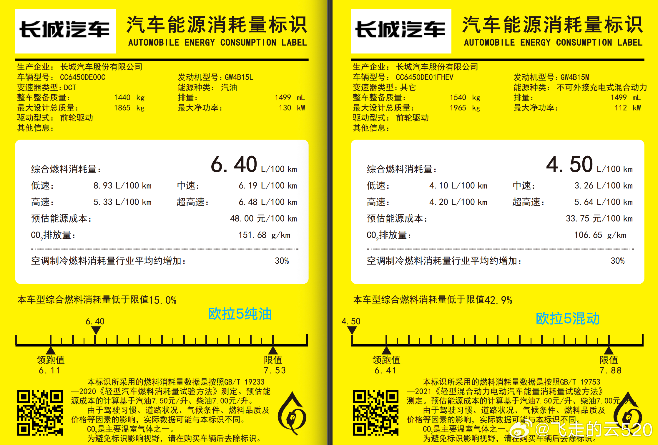 长城汽车在工信部发布了欧拉5的能耗标签,给大家对比一下汽油版、混动版
