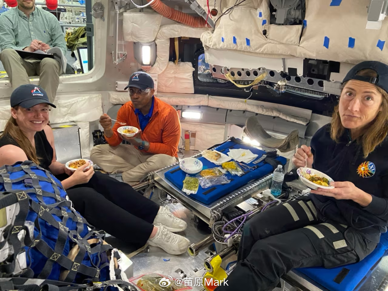 整个飞船相当于两辆小货车的空间,睡眠空间很小,四个人第一次睡觉分两次,每次4小时,唤醒音乐是《Sleepyhead》、《Green Light》