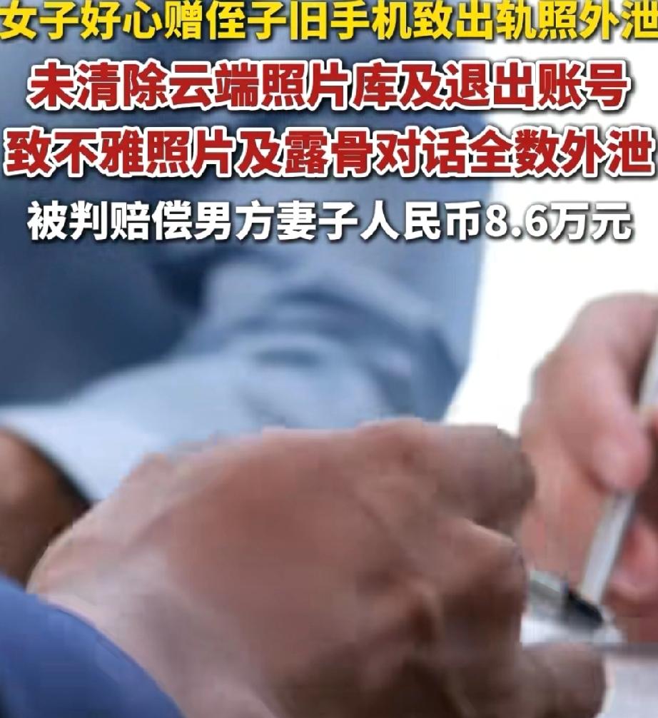 台湾女子新购了一部手机。侄子知道后,求女子把旧手机让给自己用。女子想,反正旧手机自己用不着了,就给了侄子。 侄子打开旧手机一看,对女子的好印象彻底没啦。由于女子未退出云端相册和账号,里面大量的出轨照片和露骨的聊天记录都曝了光。男方妻子得知,将女子告上了法院。 女子辩称侄子未经同意查看相册,侵犯了自己的隐私。法官认为,女子主动交付手机,理应预见内容可能被接触,加以设防。驳回了她的被侵犯隐私的主张。法官认定女子严重破坏男方妻子的配偶权,判处赔偿精神损失费40万新台币(约8.6万元人民币)。该案可上诉。 女子做事荒唐,终归付出了代价。此案件同时提醒大家,处理旧设备时,要重视数据安全,避免由此带来不必要的损失。 女子赠侄子旧手机致出轨照外泄出轨