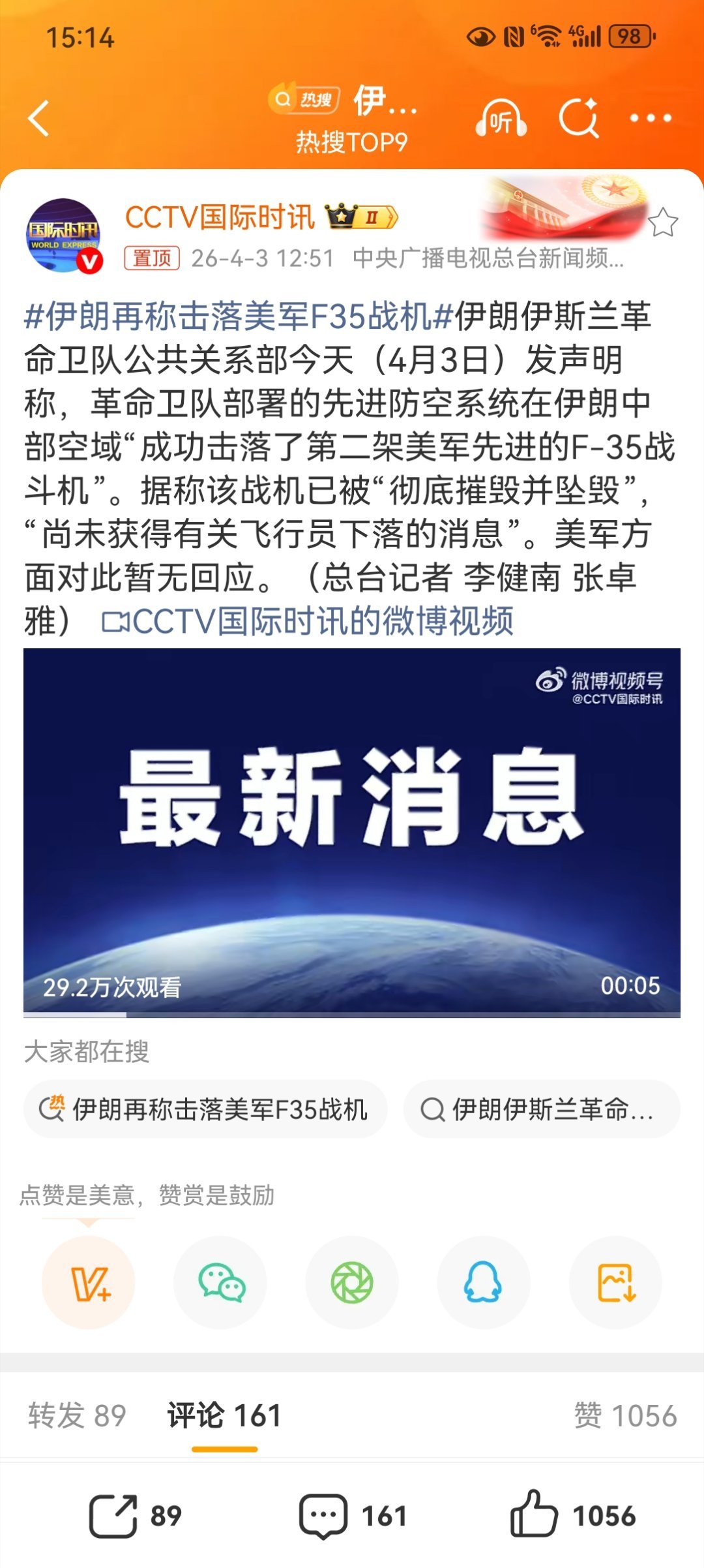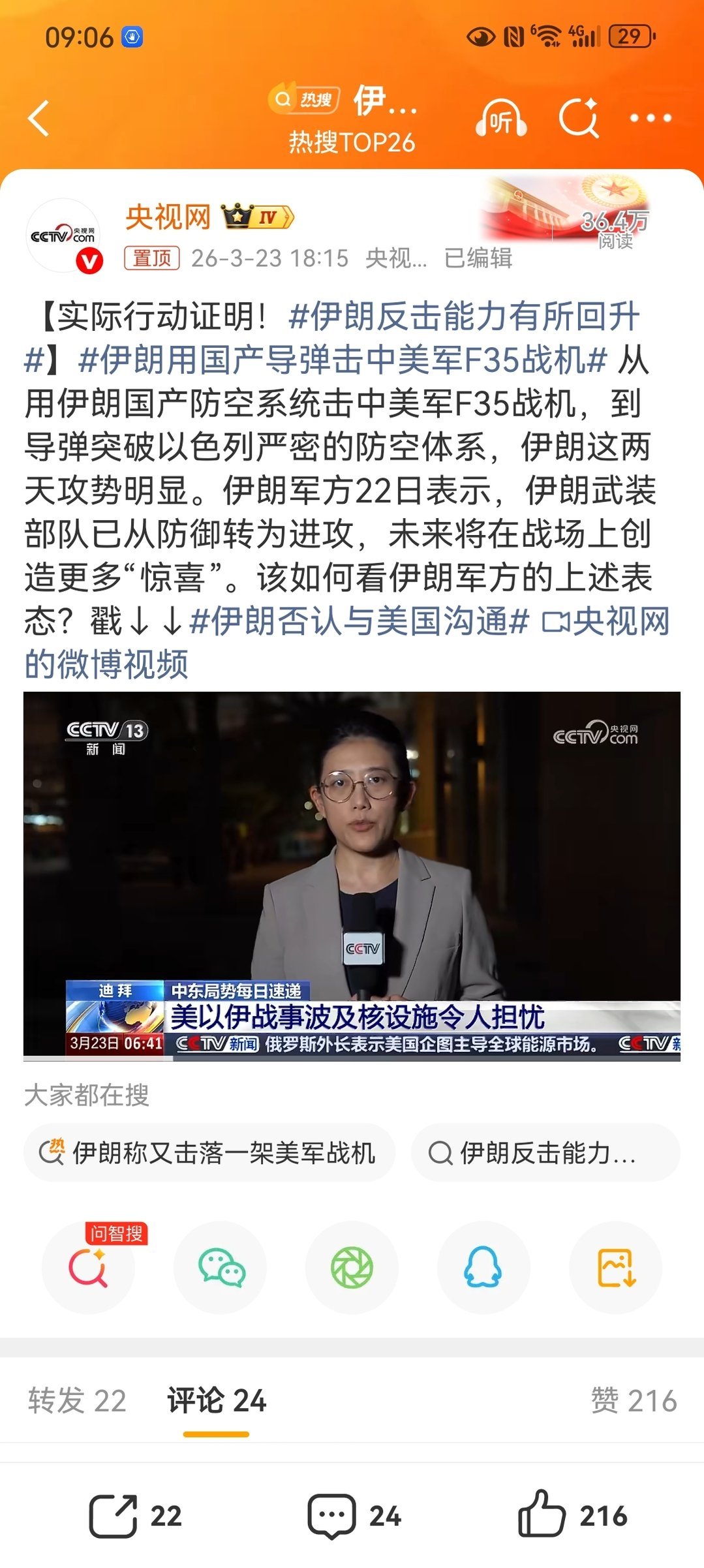 伊朗再称击落美军F35战机希望伊朗能天天击落美军F35战机,让特朗普主动撤军。可伊朗单方面发布的这类消息我不敢相信啊,毕竟美以飞机在伊朗领空一直是如入无人之境,而且上次伊朗用国产导弹击中美军F35战机的新闻,美国驻华大使馆官方微博在央视发布相关消息前近4小时就已经辟谣,称“没有任何一架美国战斗飞机被伊朗击落”,并指出美方在“史诗狂怒行动”中出动8000多架次战机无损失。