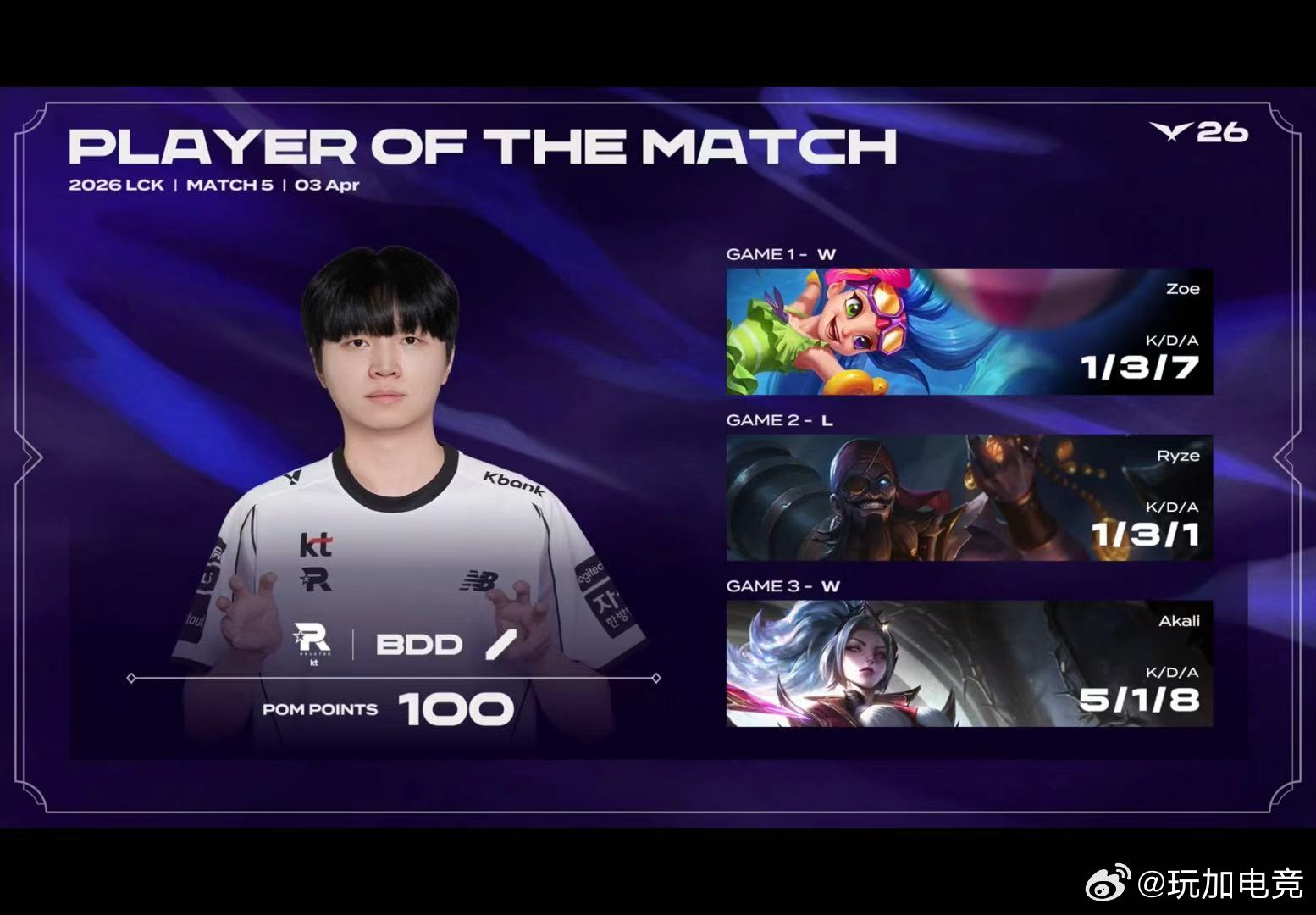 2026LCK第二赛段小组赛 KT 2:1 GEN本场POM给到BDDGEN被