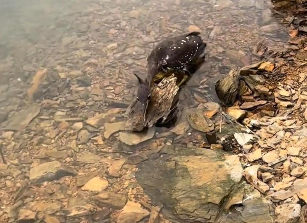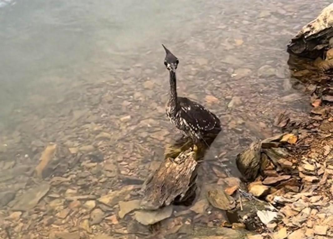 “神秘大鸟!”浙江千岛湖,一男子和朋友开船回岸边,无意间在浅滩发现一只被废弃渔网