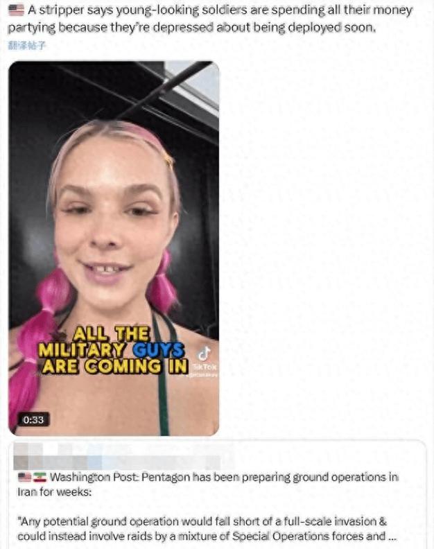 近日,美国一家脱衣舞俱乐部从业者,在海外社交平台发视频爆料,撕开了美军最真实的一面——大批即将奔赴伊朗战场的士兵,扎堆涌入色情场所,挥金如土,一夜花光所有积蓄,用放纵麻痹自己,嘴里反复念叨着“去了就回不来了”,画面让人唏嘘。 这位从业者透露,平时也有美军士兵来消费,但都很克制,花钱算着来。可最近,来的士兵数量翻了好几倍,状态更是判若两人:有人一进门就甩出一叠现金,点名要最好的服务,从不讨价还价;有人直接取光银行卡里的钱,喝酒、点舞,怎么快活怎么来,直到一分不剩才肯离开。 更让人破防的是,这些士兵大多很年轻,有的才二十出头,看起来单纯得不像常年当兵的人。他们脸上强装笑容,心里却满是消沉,有的甚至跟她吐槽,下周就要被派去伊朗,还哭着说自己没来得及结婚、没来得及孝顺父母,就要去死了。 很多人疑惑,美军装备世界最先进,为啥一提到打伊朗就绝望到这种地步?答案很简单:他们心里门儿清,伊朗不是以前那些好欺负的对手,这场战争根本没有胜算,去了大概率就是送死。 更让士兵们心寒的是,他们到现在都不知道开战的真正理由。特朗普政府推动对伊战争,理由牵强又混乱,到最后干脆赤裸裸地邀请各国去伊朗“零元购”、抢夺石油,这种土匪般的言论,让士兵们彻底明白,自己不过是政客博弈的棋子,不是为国家正义而战,而是为政客的贪婪和野心送命。 其实,美军战前放纵不是第一次,二战、越战时期,就有士兵靠色情、酒精缓解恐惧。但这次不同,士兵们的挥霍,本质上是绝望到放弃的表现——士气跌到谷底,没有活下去的信心,只能趁最后时刻享受片刻快活。 要知道,战争从来不是只看装备,士气和战斗意志才是关键。如今大批美军已部署中东,随时可能奔赴战场,他们花光积蓄、告别家人,做好了赴死的准备,背后是无数家庭的破碎。后续,美军士气是否会彻底崩溃,特朗普又会如何安抚士兵,或将成为中东战事的新看点。 说到底,美军的悲凉,都是美国霸权和政客野心造成的。战争没有赢家,无论是这些被迫赴死的美军士兵,还是伊朗人民,最终都会成为战争的受害者。