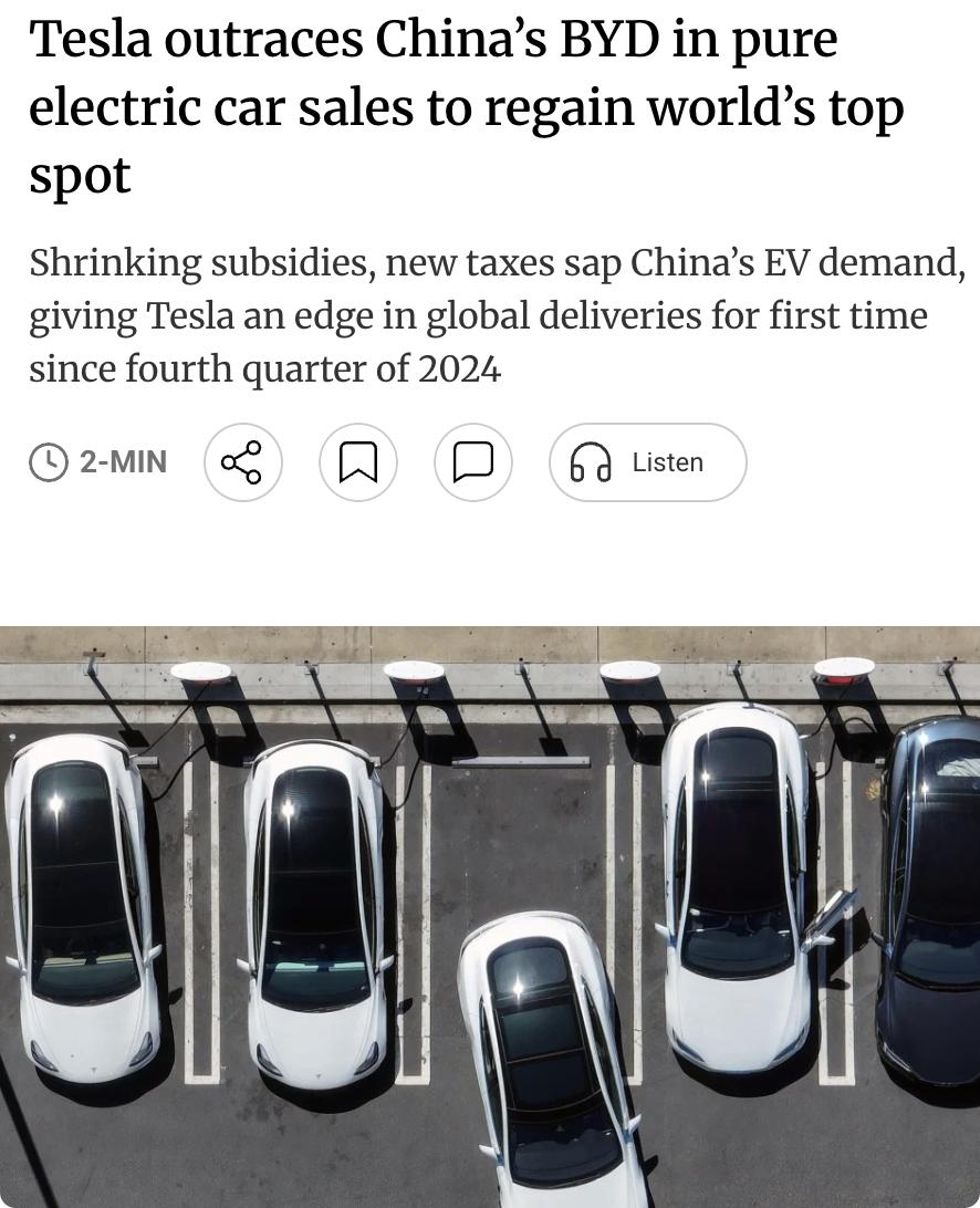 外媒:特斯拉在2026年第一季度以35.8万辆的纯电动汽车交付量重新夺回全球销量冠军,同比增长6.5%,这是自2024年第四季度以来首次超越比亚迪。 同期比亚迪纯电动汽车销量大跌25.5%至31万辆,主要受中国国内补贴缩减、新税政策拖累及本土需求疲软影响,而特斯拉凭借全球化客户基础保持相对稳定。