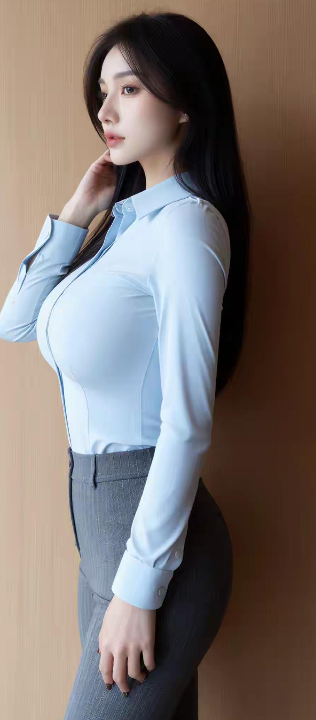 优雅职场风,浅蓝色衬衫搭配灰色高腰裤,气质满分!
