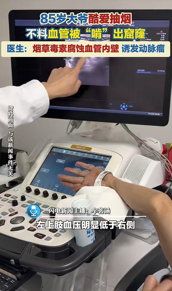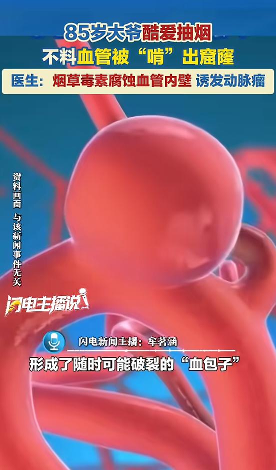 “悲剧还是发生了!”近日,浙江,一85岁大爷酷爱抽烟,就算年纪大也没想克制一下,结果不久前,他发现自己痰中带血,于是去医院就诊,医生检查后,发现大爷血管壁已经被 “啃” 出个洞,最终确诊为动脉瘤!网友:这下后悔了! 最近在浙江,一位85岁的大爷,因为一辈子嗜烟如命,最终栽在了烟上,说出来大家可能都有共鸣,很多老人年纪大了,就执着于自己的老习惯。 这位大爷也一样,抽烟抽了几十年,瘾大得很,家里人天天劝他少抽点,甚至让他戒烟,可大爷总不当回事,还说“抽了一辈子了,戒不掉,也没必要戒”,压根没把劝诫放在心上。 就在不久前,大爷发现自己咳痰的时候,痰里带着血丝,一开始他还没太在意,觉得可能是天气干燥,或者抽烟抽多了嗓子不舒服,可连着好几天都这样,有时候血丝还变多了,大爷这才慌了神,赶紧让家里人送他去医院检查。 谁能想到,检查结果一出来,全家人都懵了,医生拿着检查报告跟大爷和家属说,大爷的血管壁已经被“啃”出了一个洞,最终确诊为动脉瘤。 说白了,这都是长期抽烟惹的祸,医生也明确表示,大爷血管壁的损伤,就是烟草里的毒素长期侵蚀导致的,那些有害物质慢慢破坏血管内壁,让血管壁变得又脆又薄,时间长了就形成了动脉瘤。 可能有人不太懂,动脉瘤不是肿瘤,就相当于血管壁薄弱的地方鼓出了一个包,像水管用久了壁变薄,被水压冲得鼓起来一样,而大爷的血管壁,已经薄到被“啃”出了洞,可见损伤有多严重。 要知道,动脉瘤就像个不定时炸弹,一旦破裂,后果不堪设想,尤其是大爷年纪这么大,风险就更高了。 大爷得知真相后,整个人都蔫了,脸上全是后悔的神情,嘴里反复念叨着“早知道就听家里人的话,戒烟就好了”,家里人看着他这样,既心疼又无奈,劝了那么多次,终究还是没能拦住。 这事传到网上后,网友们也炸开了锅,大多都是感慨和惋惜。有网友说“这下是真后悔了,可世上没有后悔药”,也有网友说“身边好多老人都这样,觉得老习惯改不了,殊不知这是在拿自己的身体开玩笑”。 还有不少网友提醒家里的老人,抽烟真的伤身体,别等到出了问题才追悔莫及,其实不光是这位大爷,很多老人都有这样的想法,觉得抽烟抽了一辈子,戒不戒无所谓。 可大家不知道,香烟里的尼古丁、一氧化碳这些有害物质,对血管的伤害从来都是潜移默化的,长期吸烟会损伤血管内皮,加速动脉粥样硬化,让血管壁失去弹性,慢慢就会诱发各种血管疾病,动脉瘤就是其中一种。 希望这件事能给大家提个醒,不管年纪多大,抽烟的习惯真的该改改了,尤其是老年人,血管本身就不如年轻人有弹性,再加上长期抽烟,损伤只会更严重,别等到真的查出毛病,像这位大爷一样后悔,就真的晚了。 愿每一位老人都能重视自己的身体,戒掉坏习惯,安安稳稳度过晚年。