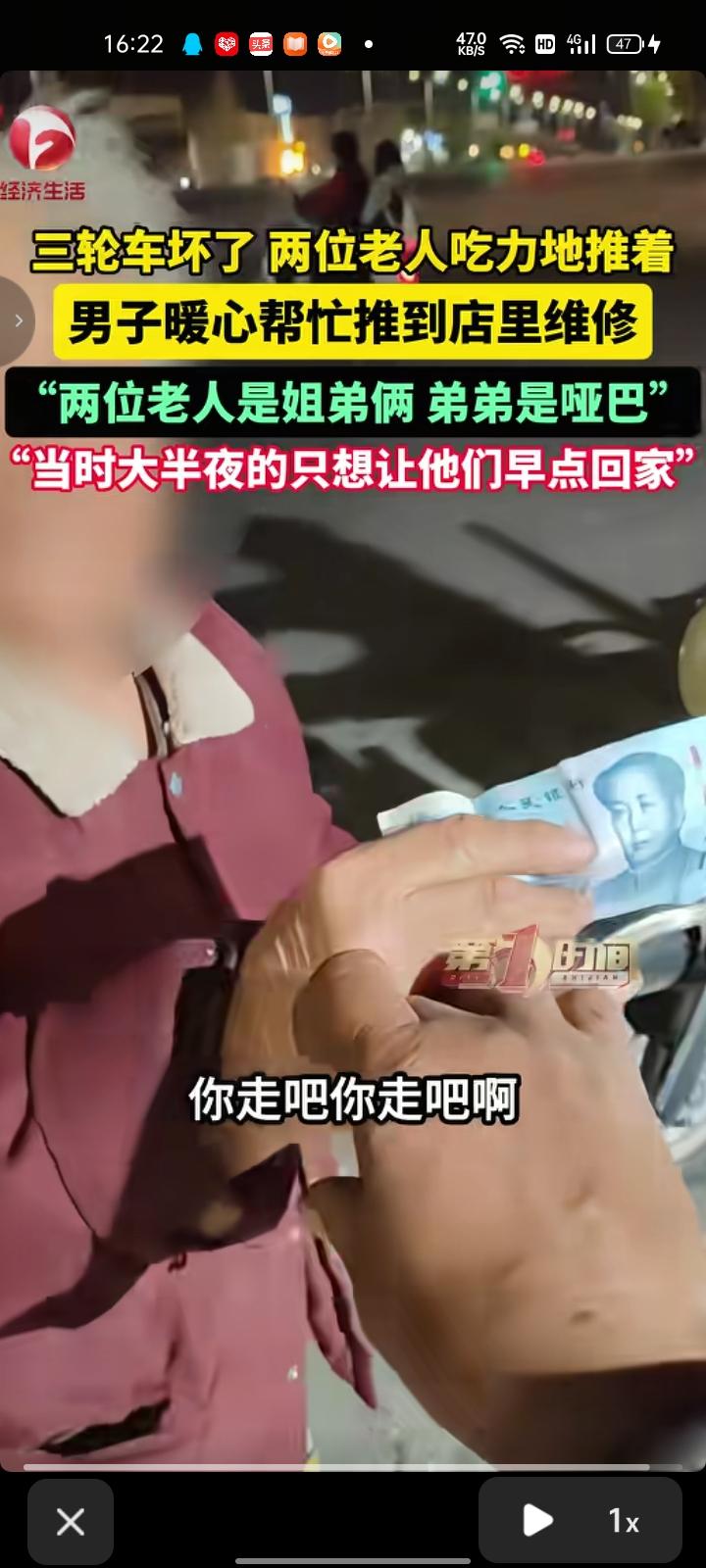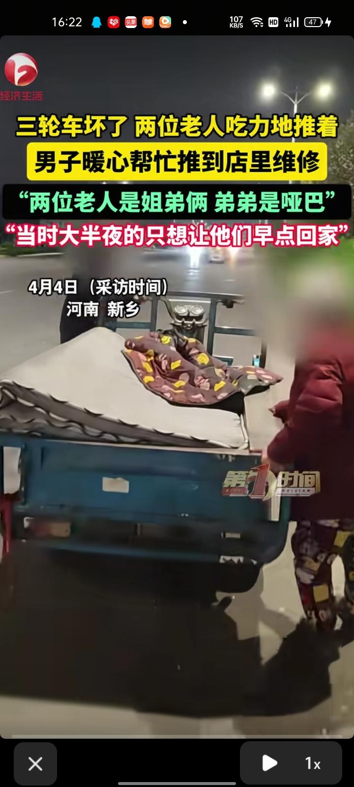 4月1日,河南新乡。网友发视频表示,半夜遇到两个老人吃力的推三轮车,里面是捡来的废品,他们骑着骑着车就不走了。于是,他帮忙把三轮车推到店里维修。 两老人是姐弟俩,弟弟是聋哑人。老人母亲去世后,她就把弟弟接过来照顾了,到现在已经有20多年。听到这句话,真让自己感动到落泪,当时大半夜的只想让他们早点回家街头摆摊老人