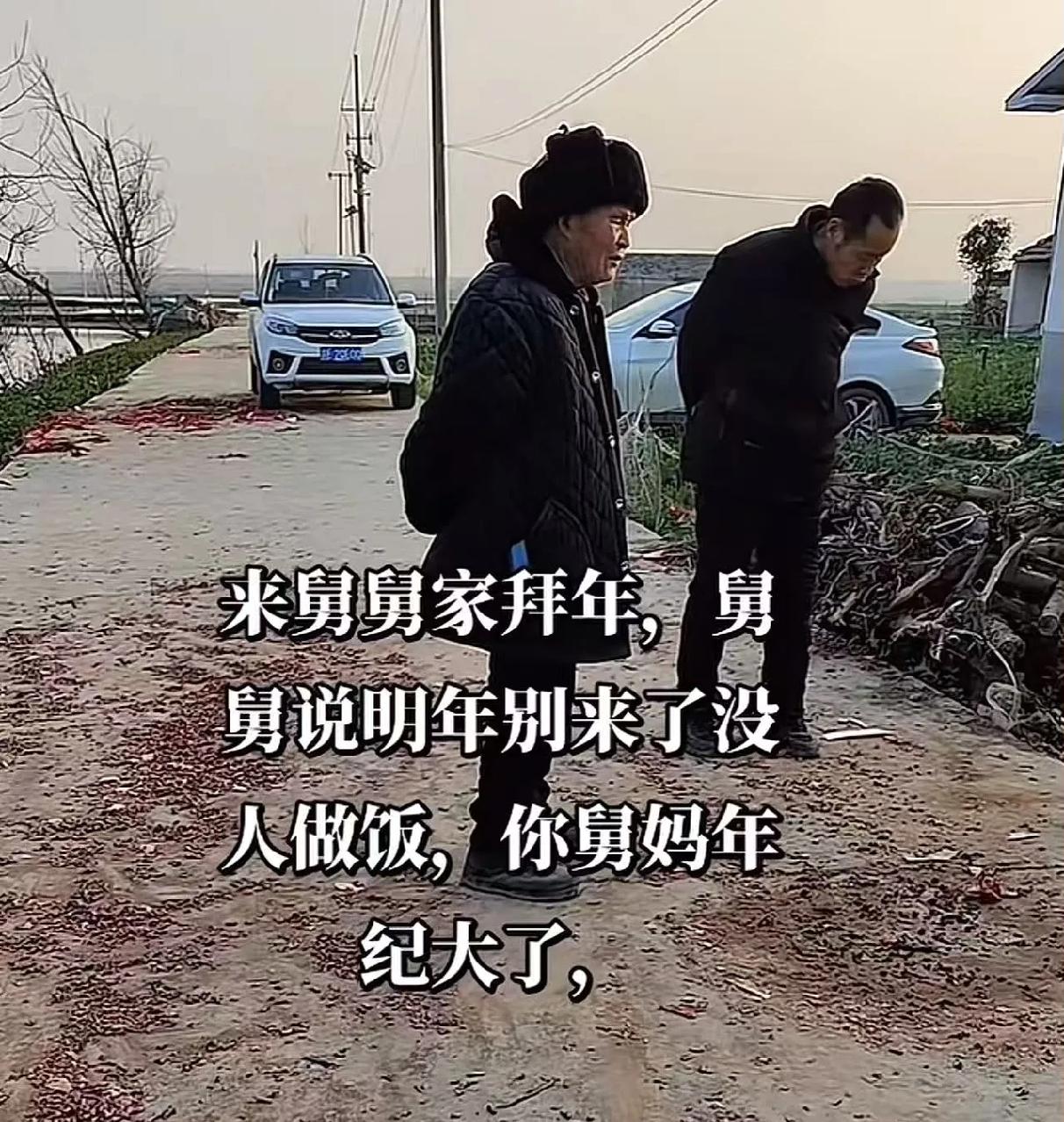 今年春节,一男子提着2箱奶、1桶油、1袋米跟2瓶酒去舅舅家拜年,吃完饭后舅舅却突然含着泪说:“明年再别来了,没人做饭,我跟你舅妈都年纪大了,干不动了……”。男子一脸错愕,更红了眼眶! 大年初二,35岁的阿强天不亮就爬起来,把给舅舅准备的年货仔细搬上了车,两箱纯牛奶、一桶食用油、一袋东北大米,还因为舅舅爱喝两口,阿强就又回到屋里,给舅舅拿了两瓶好酒。 在阿强的记忆里,小时候都是他父母带着他去给舅舅拜年,那时候家里条件不好,能给舅舅拿一箱牛奶,已经算不错的拜年礼。如今阿强长大了,生活条件也变好了,还买了车,于是今年,他准备了丰厚的拜年礼,还开车带全家人去舅舅住的村子。 他一边开车往乡下赶,一边心里还在盘算着,一等会儿到了舅舅家,舅妈肯定又会端出一大桌热乎菜,炖得软烂的排骨、炸得金黄的丸子,还有他最爱吃的舅妈包的饺子。 原来从小到大,每年来舅舅家拜年,舅妈一家都招待得很周到,甚至成了他最期待的事情,他更把这里当成第二个家。 车刚停稳,舅舅就拄着拐杖迎了出来,脸上是藏不住的笑,可阿强却发现,舅舅的背比去年更驼了,头发也白了大半。 进屋后,阿强没看到熟悉的忙碌身影,厨房里冷冷清清,只有舅妈坐在沙发上,精神头大不如前,连起身招呼都有些费劲。 饭桌上,菜也比往年少了一大半,都是舅舅简单做的几个家常菜,没了往年的热闹劲儿。阿强心里咯噔一下,却没好意思多问,只一个劲儿给舅舅舅妈夹菜,说着拜年的吉祥话。 吃完饭,阿强帮着收拾碗筷,舅舅却拉着他走到院子里,还背对着他沉默了好久,才红着眼圈,声音沙哑地开口:“阿强啊,明年……明年再别来了。” 阿强当场就懵了,一脸错愕,以为自己哪里做错了,刚要开口,舅舅就摆了摆手,叹了口气说:“不是你不好,是我跟你舅妈年纪大了,身子骨一年不如一年,再也做不动一大家子的饭了。以前每年你们来,她提前好几天就开始准备,从早忙到晚,累得腰都直不起来,可她高兴。现在她实在干不动了,我也老了,做不出像样的菜招待你们,怕委屈了你们……” 话没说完,舅舅的眼泪就掉了下来。阿强瞬间红了眼眶,鼻子一酸,眼泪也忍不住了。他这才明白,舅舅不是嫌他来,是怕自己招待不好,怕给晚辈添麻烦,怕自己再也给不了孩子家的温暖。 阿强一把抱住舅舅,哽咽着说:“舅,您说啥呢!我们来拜年,不是为了吃那一口饭,是为了看您和舅妈啊!以后我来,不用做饭,我给您二老做,我给您二老收拾屋子、干农活,您要是不让我来,我才真的难受!” 这一幕被阿强拍下来发到网上,当时就戳中了无数网友的泪点。 笔者评语: 其实长辈说“明年别来了”,不是不爱,而是爱到深处,怕自己成了晚辈的负担更怕对晚辈照顾不周。 亲情,也从不是一顿饭的事,而是无论走多远,都有人在等你回家。是无论多大年纪,都有人把你当成孩子疼。 长辈的一句“别来了”,是最深的爱。晚辈的一句“我来”,是最暖的回应。 你有没有被长辈说过类似的话?看完这个故事,你想起了家里的哪位长辈?