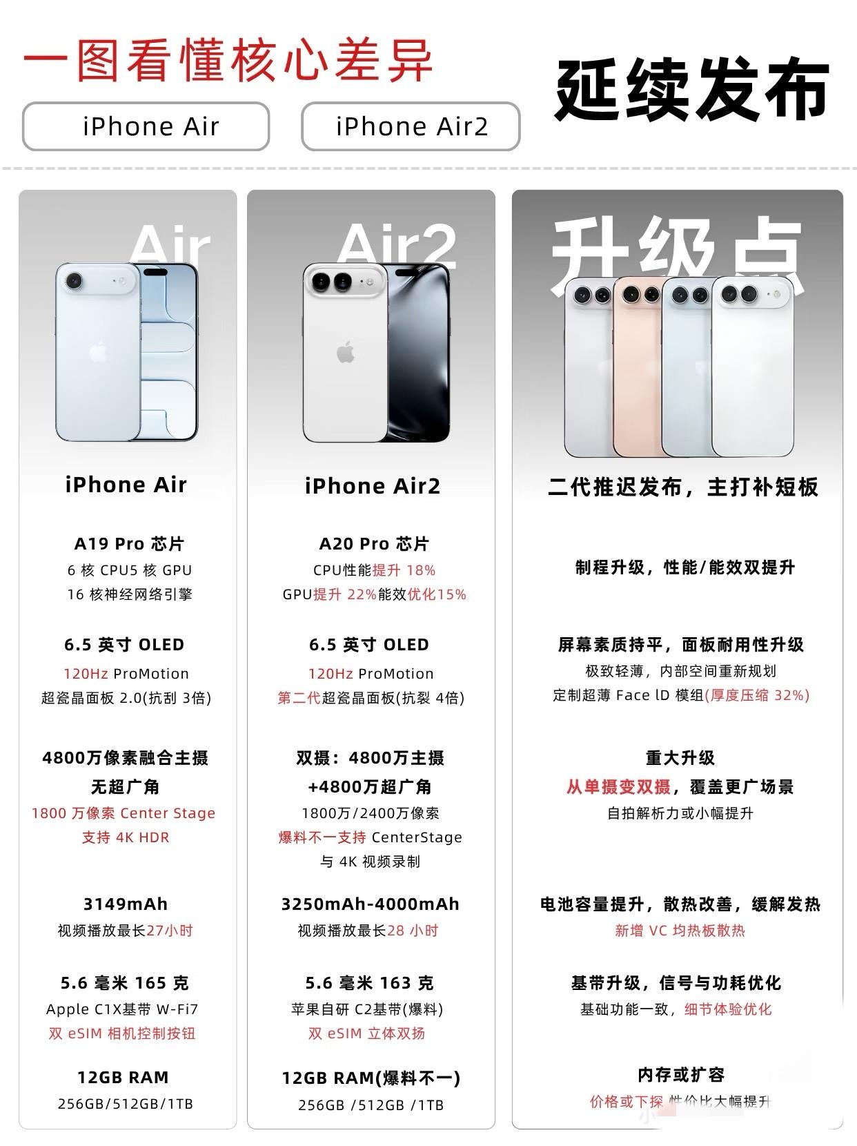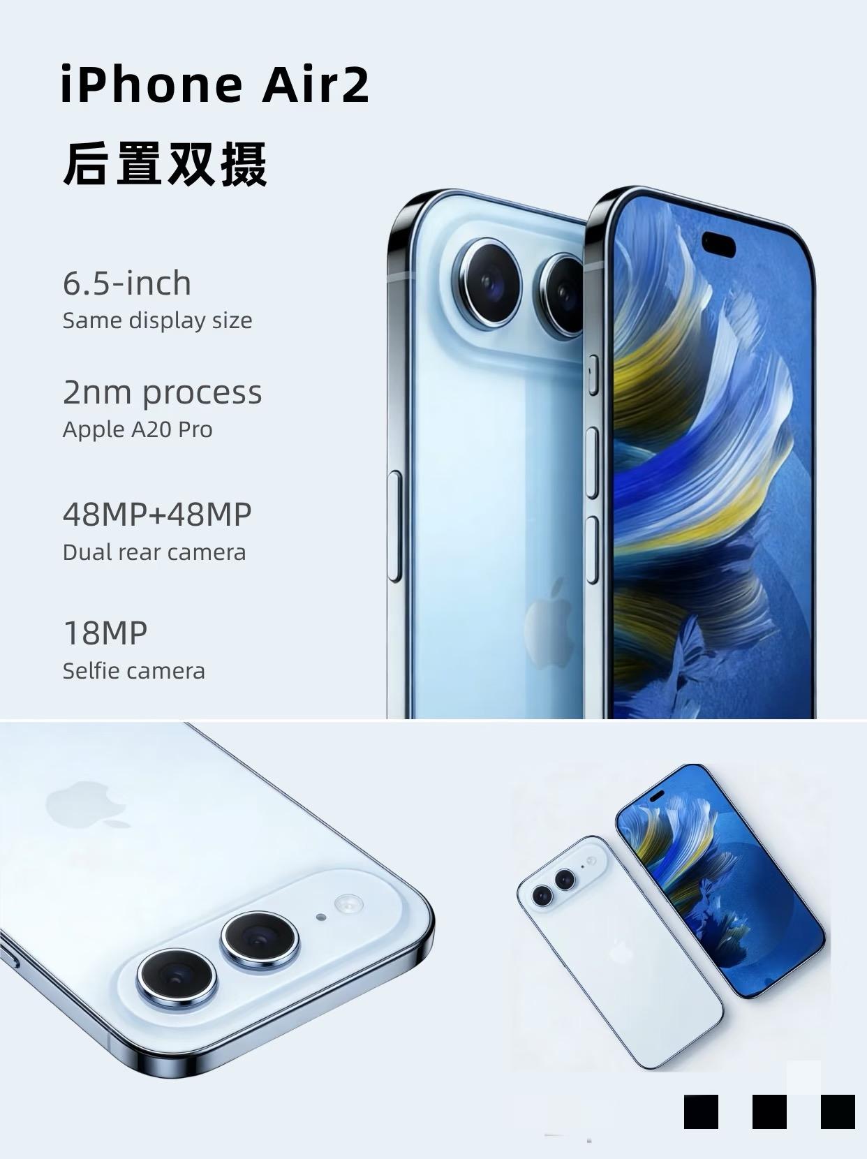 iPhone Air2补短板很到位!5.6毫米超轻薄,新增四款配色。单摄变双摄,4800万双摄拍照够强。A20 Pro芯片性能提不少,续航也给力。要是降1k,27年怕是要抢不少安卓的份额。