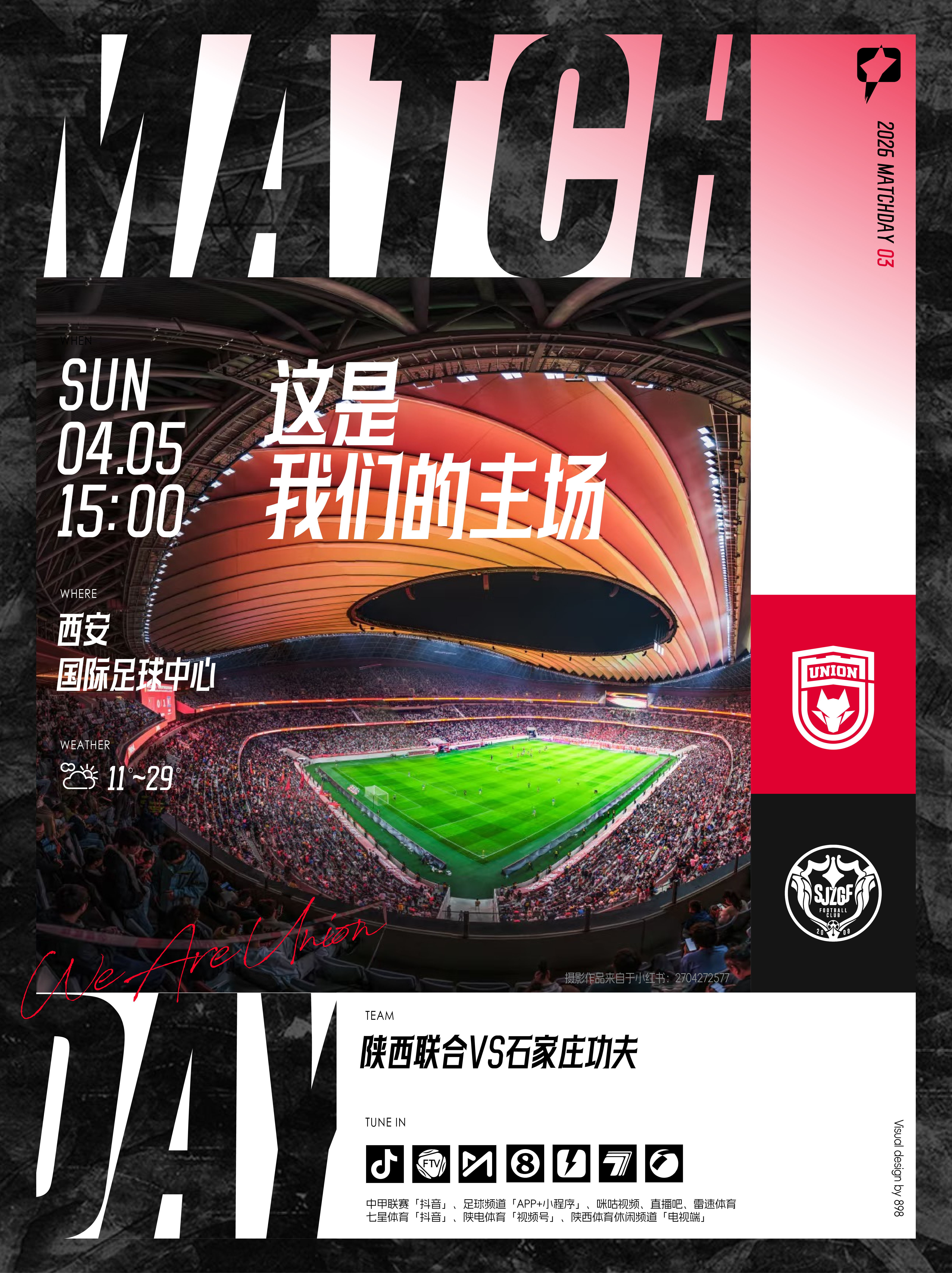 2026怡宝中甲联赛第3轮🔥「陕西联合🆚 石家庄功夫」🗓 2026.4.5(周日)15:00📍西安国际足球中心📺 直播平台:中甲联赛(抖音)|足球频道(app+小程序)|咪咕视频|直播吧|雷速体育|七星体育(抖音)|陕电体育(视频号)|陕西体育休闲频道