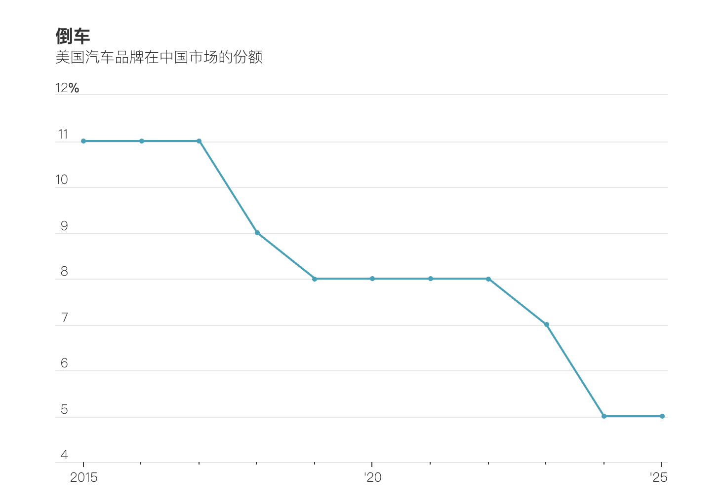 汽车市场变化更为剧烈:在比亚迪、吉利等本土电动车品牌的冲击下,美国汽车品牌在华市场份额十年间下降逾一半,到2025年仅剩5%。根据FactSet数据,标普500成分股公司在华收入占总收入比例已从2024年的7.5%降至7.1%。