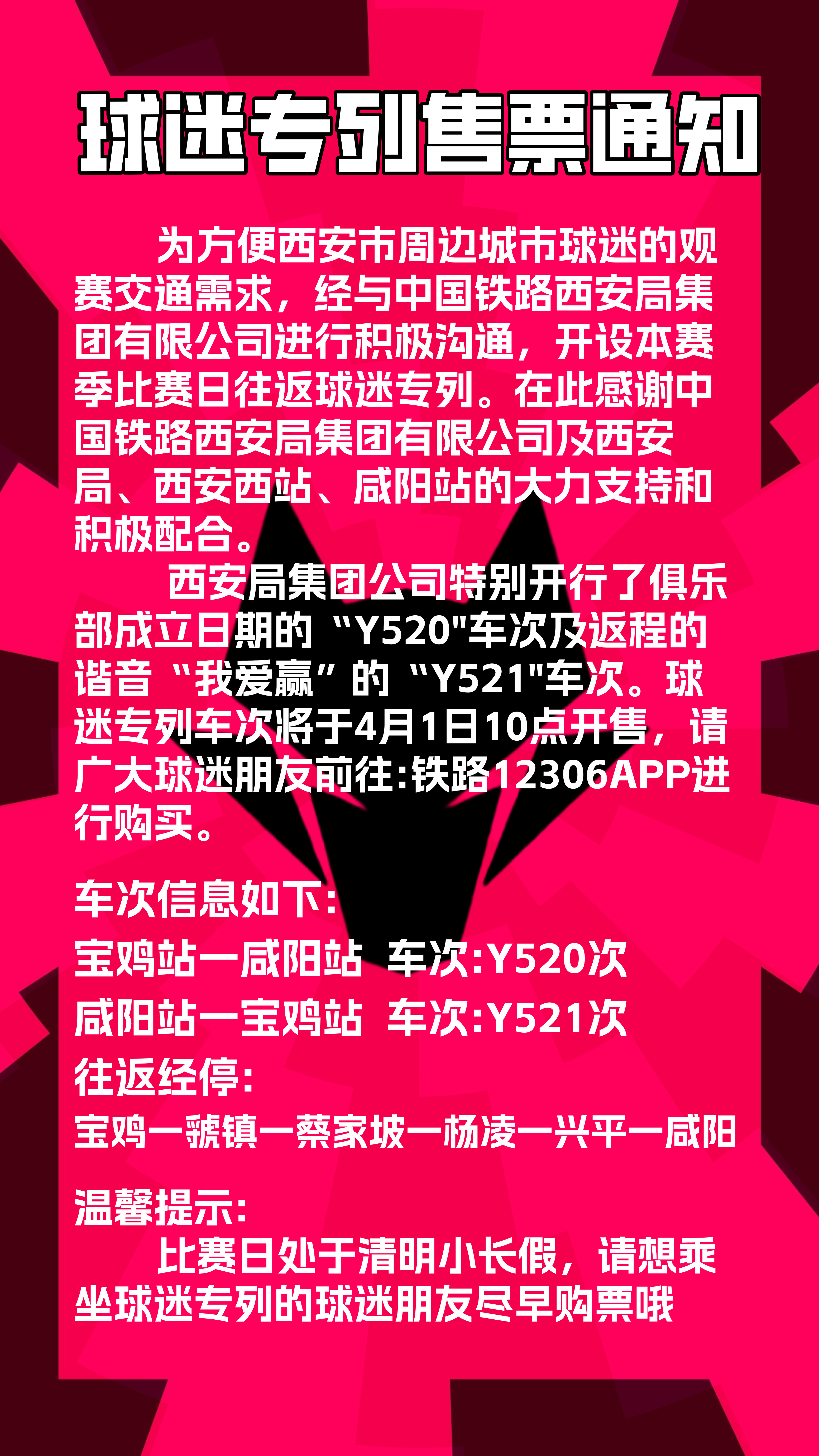 西安局特别开行对应俱乐部成立日期的Y520车次,及返程谐音“我爱赢”的Y521专属车次。