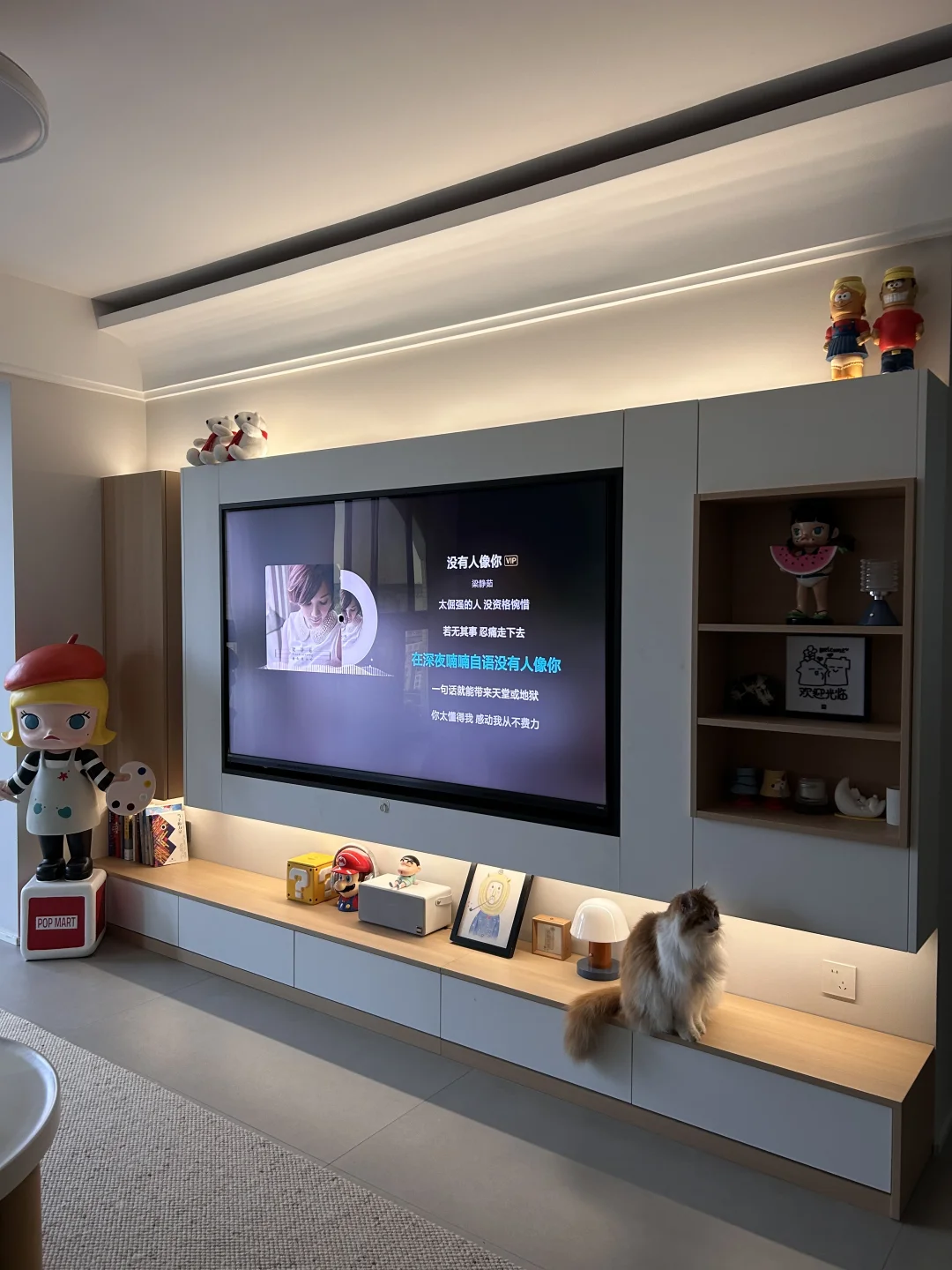之前装修的时候没有吊顶也没有做电视墙总觉得很简陋,所以在年前重新把客厅改造了一下,加装了吊顶、重新刷漆花了五千五,又花4500装了电视墙柜子,完成效果我超喜欢!