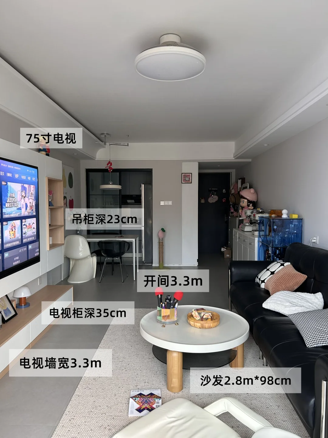 我客厅开间3.3米、电视墙长3.3米,做的电视柜宽35cm、吊柜23cm,给大家参考一下[害羞R]