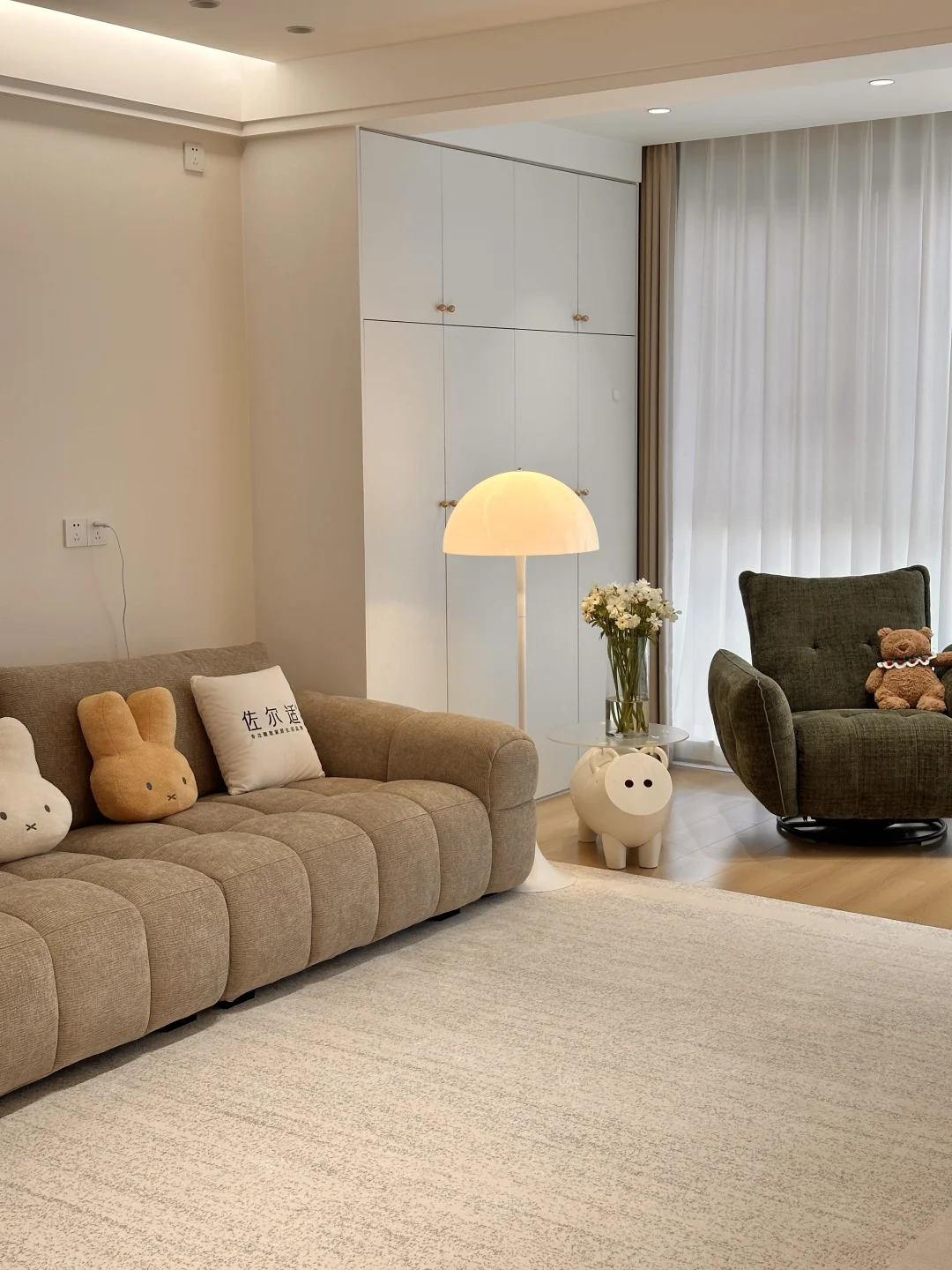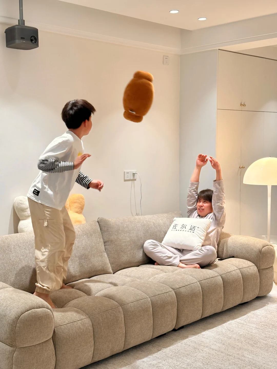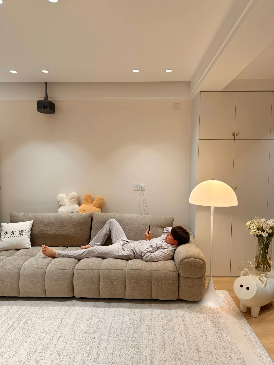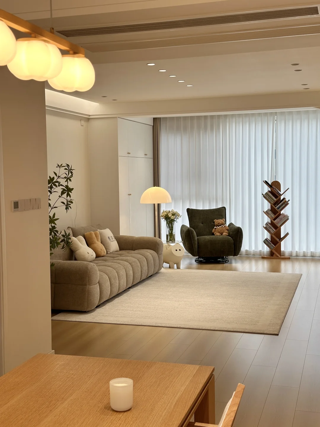 我的小家装修简简单单,大白墙➕木地板通铺,没有隔断让客餐厅的空间开阔又显大,无主灯氛围感满满~ 客厅开间有4米6,大落地窗视野比较开阔,平时大部分时间都在客厅活动,一张温柔如云朵的沙发是客厅的C位,柔软的雪尼尔面料,耐磨耐刮,还是全身可拆洗的设计,小盆友在沙发上玩耍再也不用小心翼翼啦,终于可以零食和饮料自由,这些小污渍都能轻松打理~ 圆润极简的线条,超宽做深独立可调节60~80cm,可坐可躺,无论是追剧还是小憩,都可以最舒适的角度享受,靠背柔软又能稳稳的承托,靠上去的那刻,一整天工作的疲惫瞬间释放~ 新家入住后才发现,家能够给我们提供的情绪价值远远不止有家回的那一刻,而是推开门,窝在沙发里,慢慢的享受着慢生活,或发呆,或小憩,或看书,或追剧……