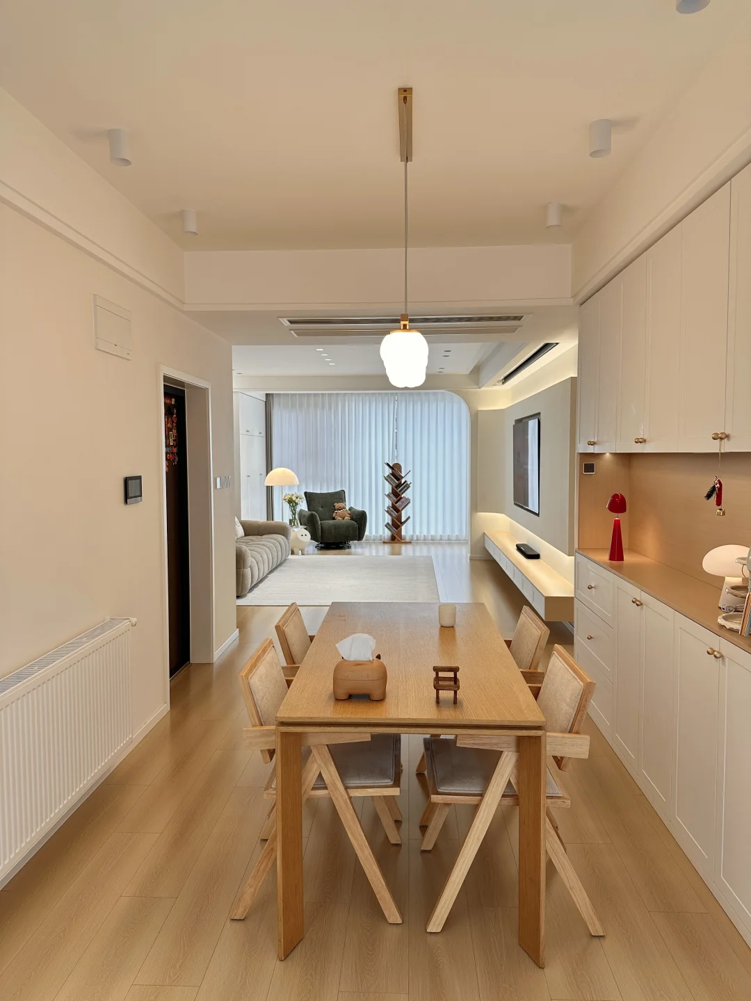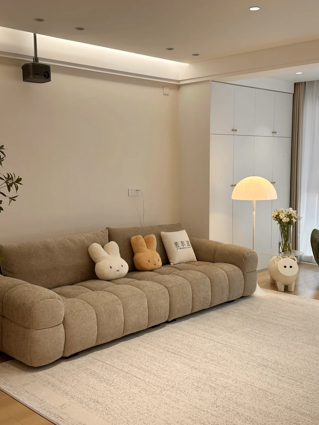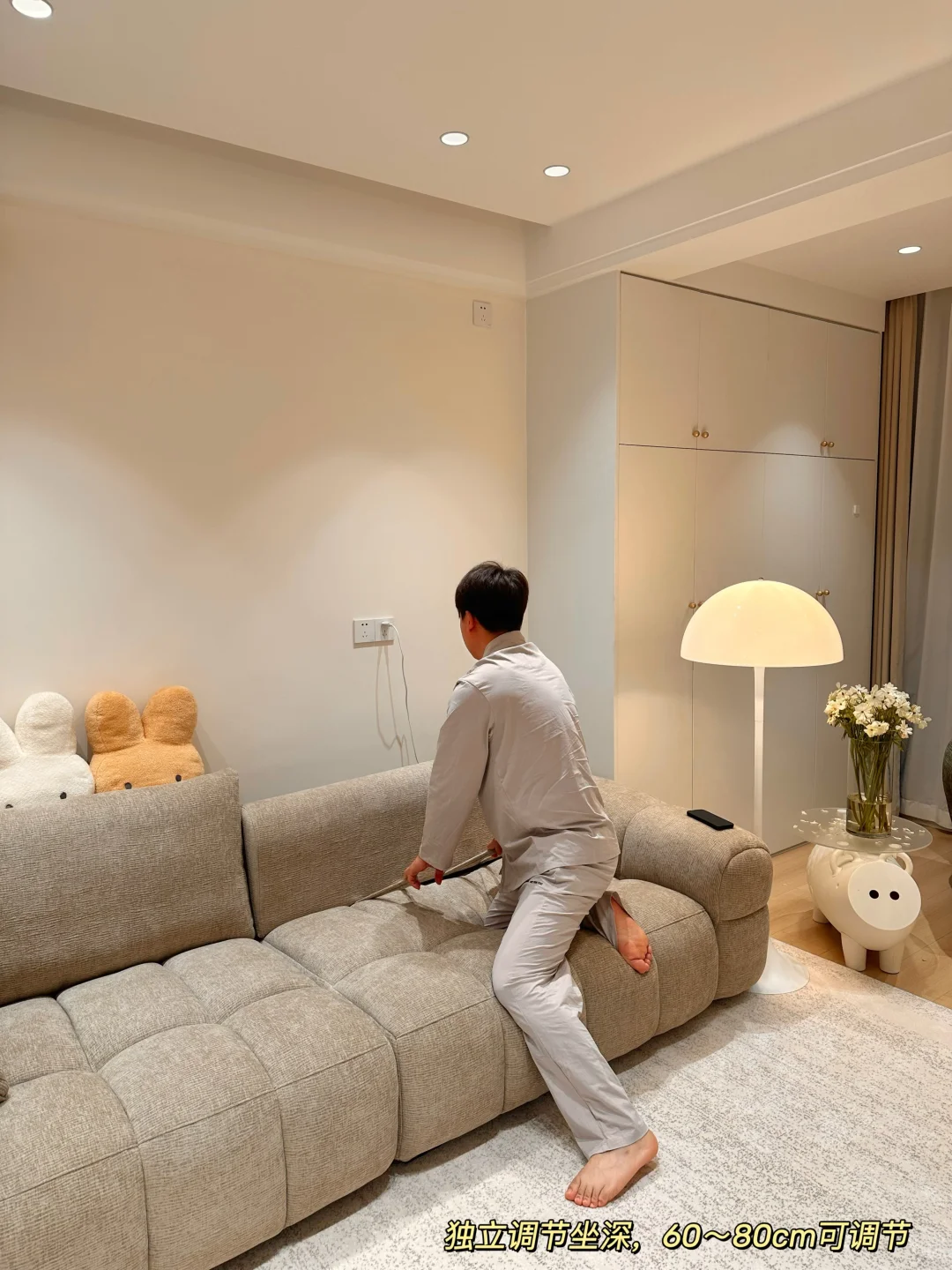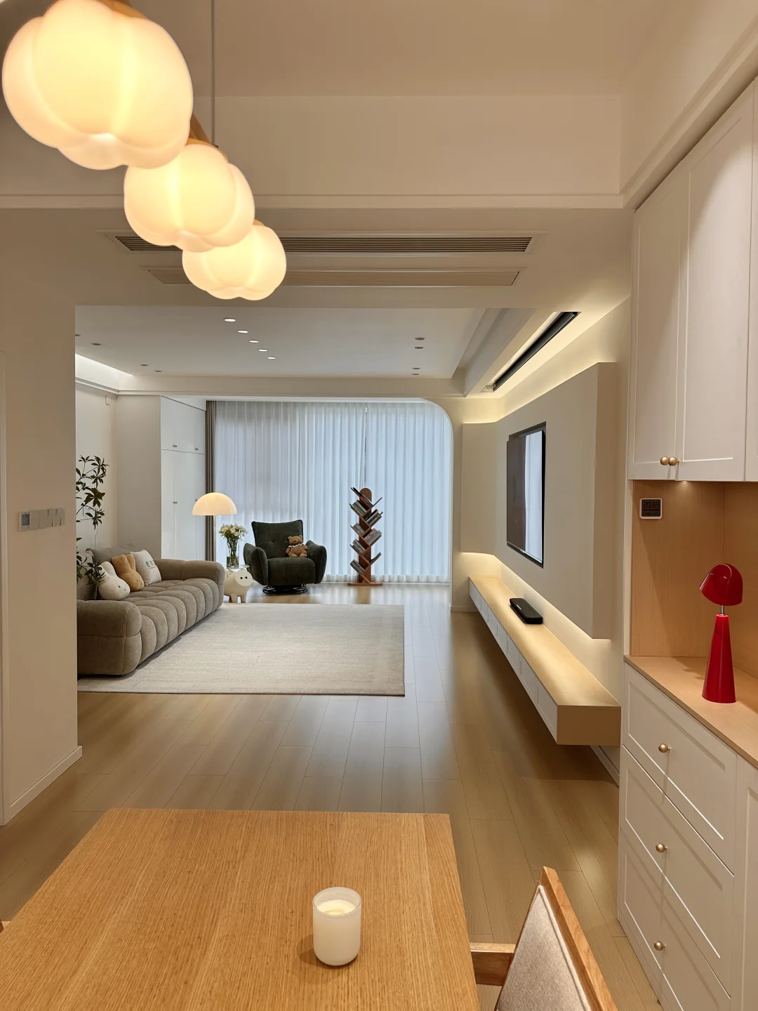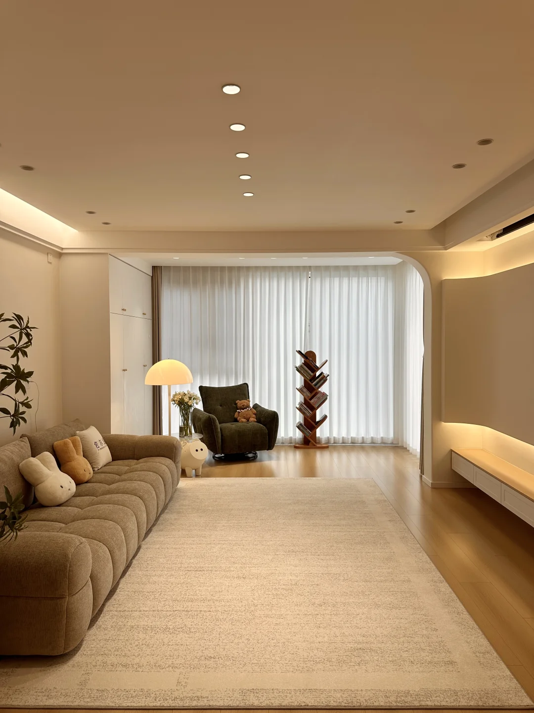我的小家装修简简单单,大白墙➕木地板通铺,没有隔断让客餐厅的空间开阔又显大,无主灯氛围感满满~ 客厅开间有4米6,大落地窗视野比较开阔,平时大部分时间都在客厅活动,一张温柔如云朵的沙发是客厅的C位,柔软的雪尼尔面料,耐磨耐刮,还是全身可拆洗的设计,小盆友在沙发上玩耍再也不用小心翼翼啦,终于可以零食和饮料自由,这些小污渍都能轻松打理~ 圆润极简的线条,超宽做深独立可调节60~80cm,可坐可躺,无论是追剧还是小憩,都可以最舒适的角度享受,靠背柔软又能稳稳的承托,靠上去的那刻,一整天工作的疲惫瞬间释放~ 新家入住后才发现,家能够给我们提供的情绪价值远远不止有家回的那一刻,而是推开门,窝在沙发里,慢慢的享受着慢生活,或发呆,或小憩,或看书,或追剧……