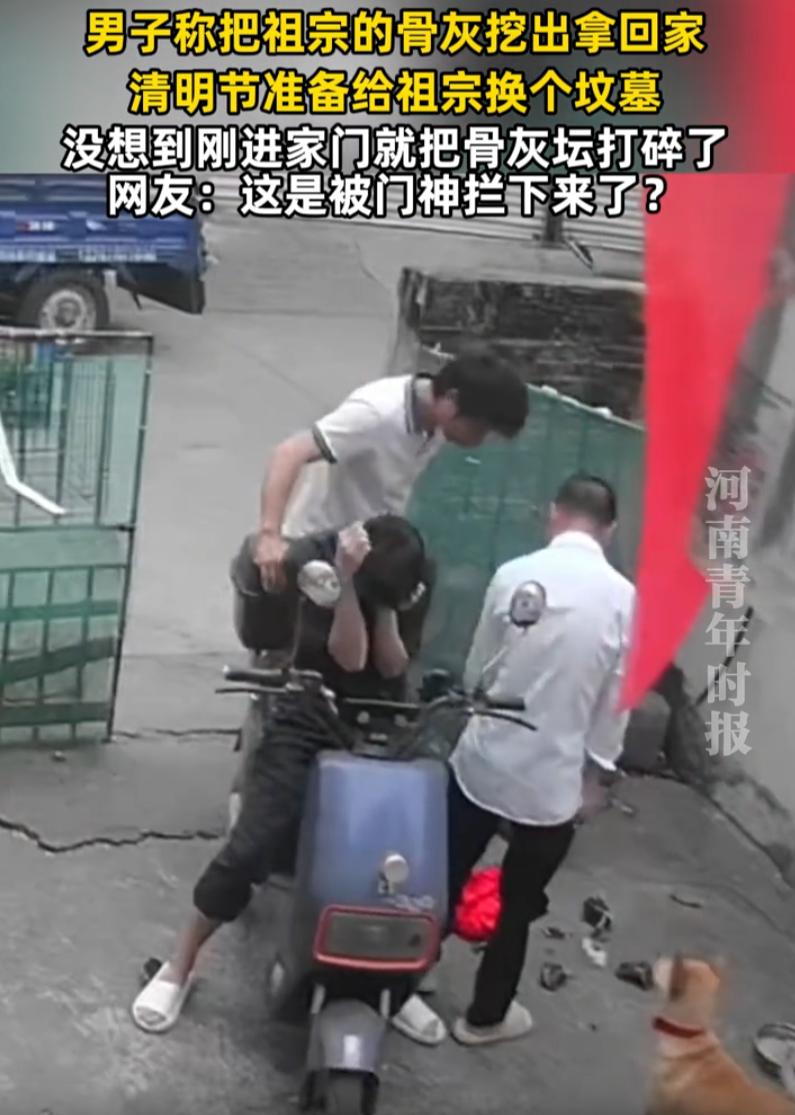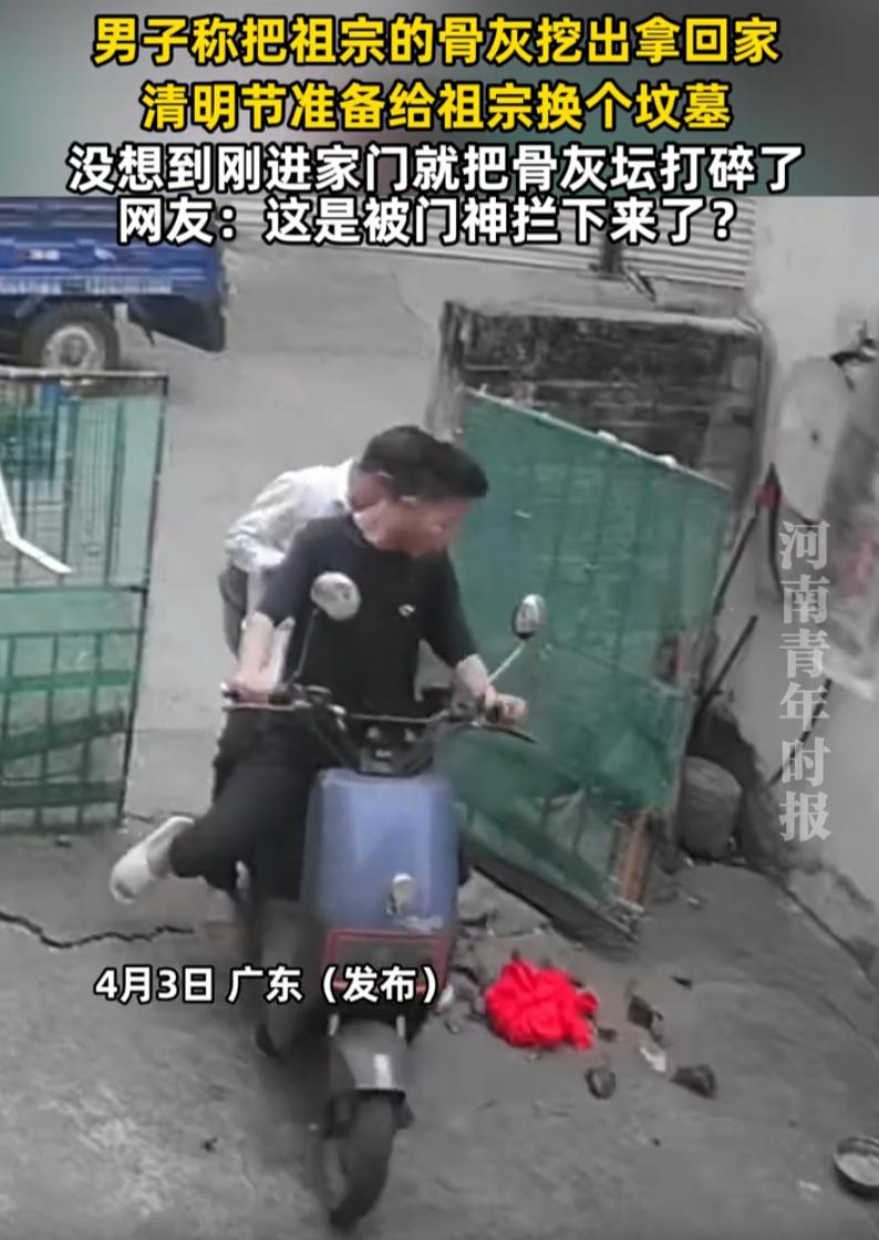 这下解释不清了!广东,两名男子把祖宗的骨灰坛挖出来带回家,没成想,刚刚骑车经过大门,骨灰坛就一下从男子的怀中滑落摔倒了地上,两个大男人瞬间跟小孩犯错一样,喊着父亲不知所措了 原本,两人是想着趁清明前后,准备给祖宗换个地方安葬。这事说来也正常,很多地方都有迁坟的习俗,选个好日子,把先人的骨灰坛请出来,换个更合适的墓地,也算是尽一份孝心 可谁能想到,这趟迁坟之路,还没进家门就出了大岔子 两人把祖宗的骨灰坛从原址请出来后,由其中一人骑着摩托车,另一人把骨灰坛抱在怀里,就这么往家赶。按照当地一些老规矩,骨灰坛在正式入土新墓之前,有时候需要先暂时安置在家里或者家附近,等看好日子再下葬 结果摩托车刚骑到大门口,也不知道是路不平,还是手没抱稳,骨灰坛就这么从怀里滑了出去,啪的一声摔在地上,碎了一地 那一刻,两个大男人当场就慌了 骑车的黑衣小伙整个人都傻了,嘴里不停地念叨:完了完了完了,这下全完了。一边说一边脸红到脖子根,急得直挠头,最后没办法,只能冲着屋里大喊:爸!爸!你快出来! 对此,网友们也是众说纷纭 有网友说,按老一辈的规矩,骨灰坛是不能直接带进家门的,只能放在屋檐底下或者墙角背风的地方,等选好日子再拿去安葬。直接抱回家,本身就不太对 还有网友说:很奇怪,好像有什么力量不让这个骨灰坛进家门。你看那个视频,大门那里也没什么门槛,正常情况下抱在怀里怎么会自己弹起来摔掉? 说实话,这种事你信也好,不信也罢,但有一点是实实在在的,两个大男人当时的反应,那种惊慌失措和愧疚,是装不出来的 说到底,敬重先人、敬畏传统,不是嘴上说说的事,而是体现在每一个细节里。这次摔碎的不只是一个坛子,更是两个后辈心里一块重重的石头。希望他们能把这事妥善处理好,毕竟他们也是好心 男子拿祖宗骨灰坛回家 进门就打碎了