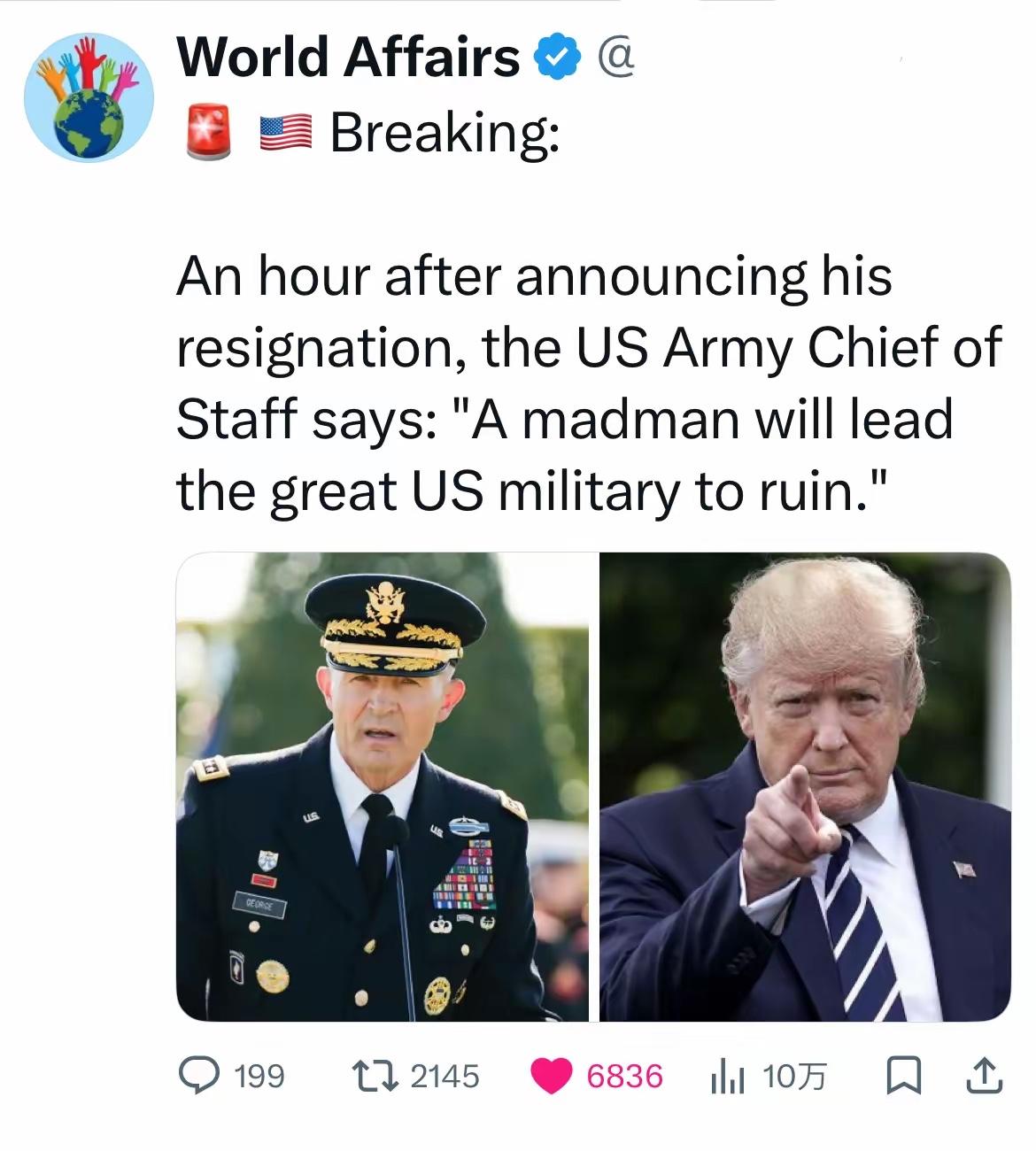 免职1小时后铿锵发声!4月2日,美国陆军参谋长兰迪·乔治,被五角大楼直接勒令强制立即辞职,即刻退休,没有任何缓冲,没有半点情面,堪称美国军史上罕见的高层清洗。 而就在被免职仅1小时后,这位身经百战的四星上将,便悲愤发声直言:一个疯子将毁掉伟大的美国陆军,更会带领美国走向毁灭。 这番话,是一名职业军人对当前美国乱局的清醒洞察,而如今不过短短数日,他的警告就已经在逐一应验,美军深陷进退两难困局。