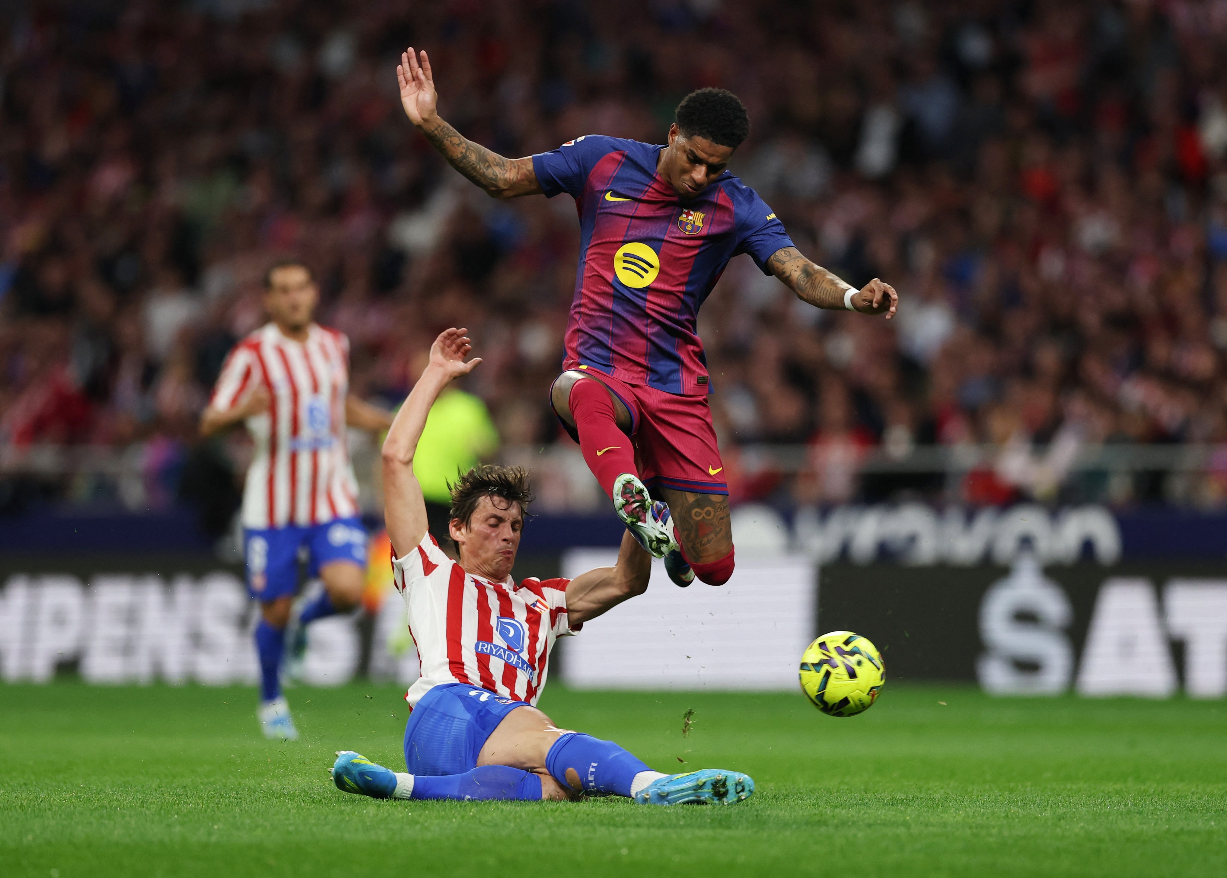 上半场比赛结束,巴萨客场1-1马竞,小西蒙尼打破僵局,拉什福德接奥尔莫助攻闪电扳