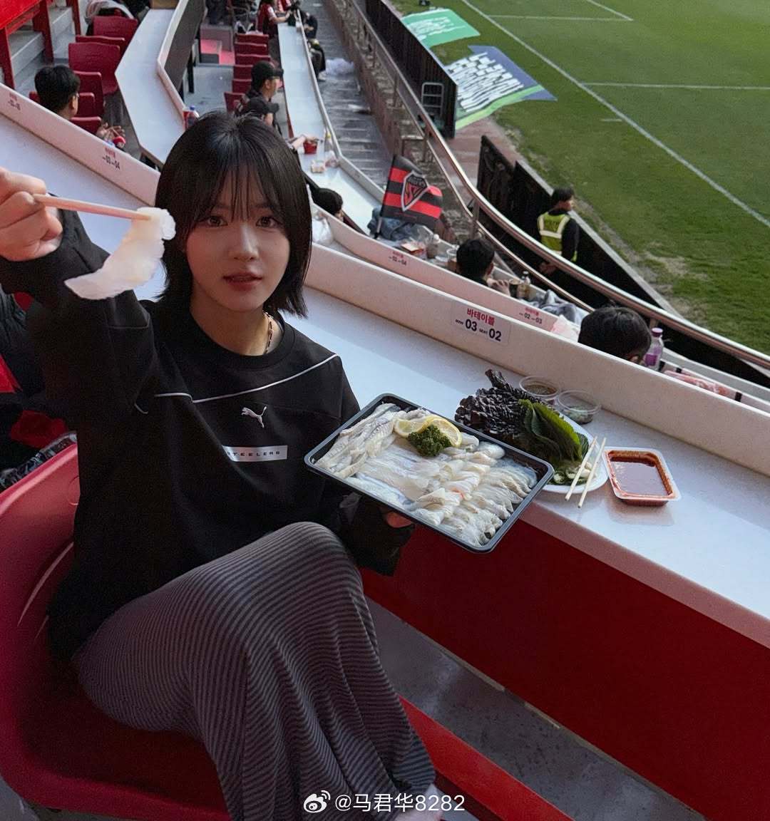 最近“现场观赛美食”已经升级到春季刀鱼(鲽鱼)生鱼片了。这个女生一边看足球,一边居然还能吃生鱼片。
