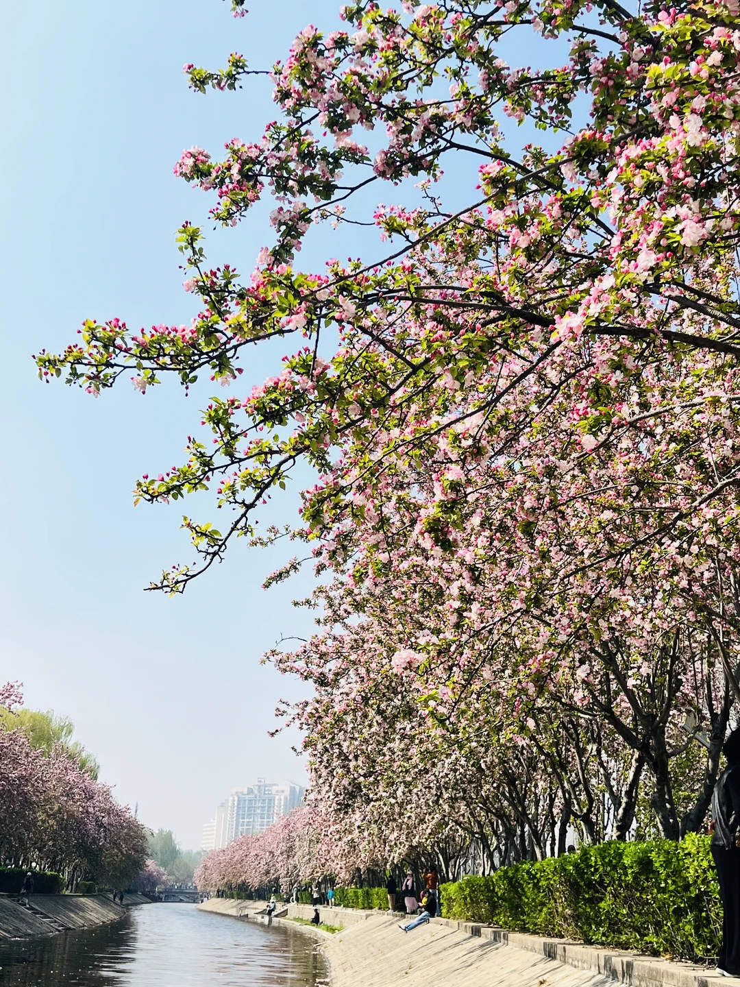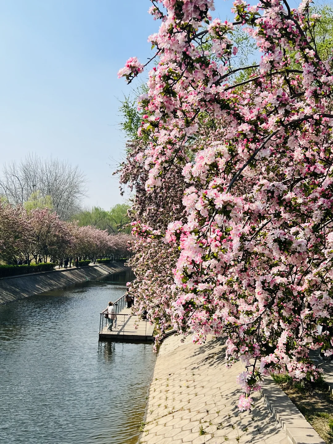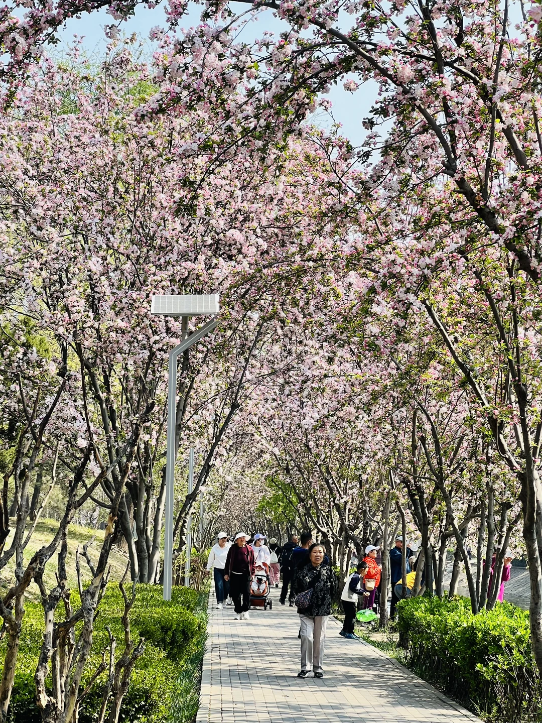 📸照片均为2026.4.4实拍 望京海棠花溪全面盛花啦~[派对R] 北京春天不能错过的海棠花盛宴🌸 📍位置:望京 地铁望京南站B1口出就能看到 一直走到望京街过了马路,这边人少,海棠马路纵深感非常适合拍人像P5P8 蜿蜒河道上满满粉色海棠 比元大都毫不逊色,配衬远处的望京建筑 蓝天春日微风拂面 逛起来十分舒服😌