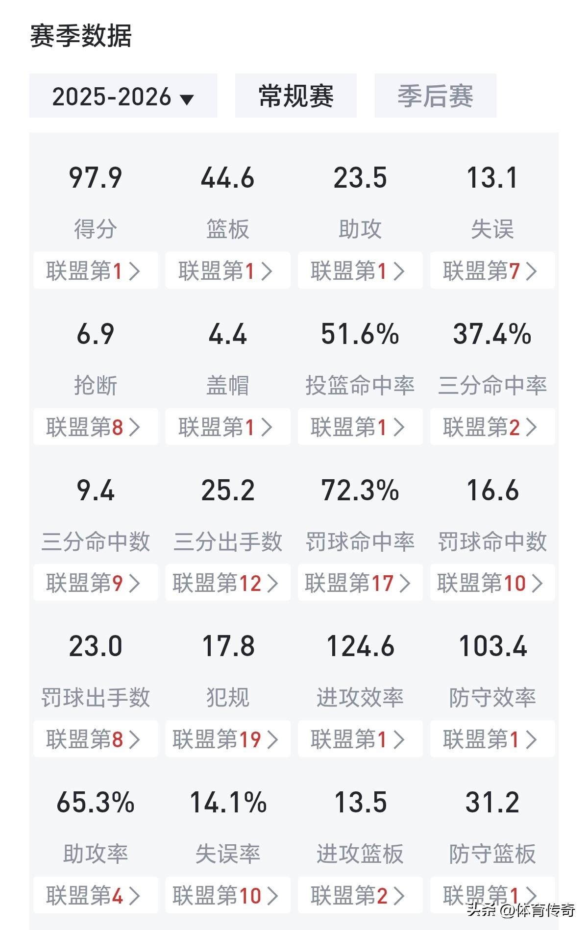 1.每场比赛可以得到97.9分,联盟得分第一。