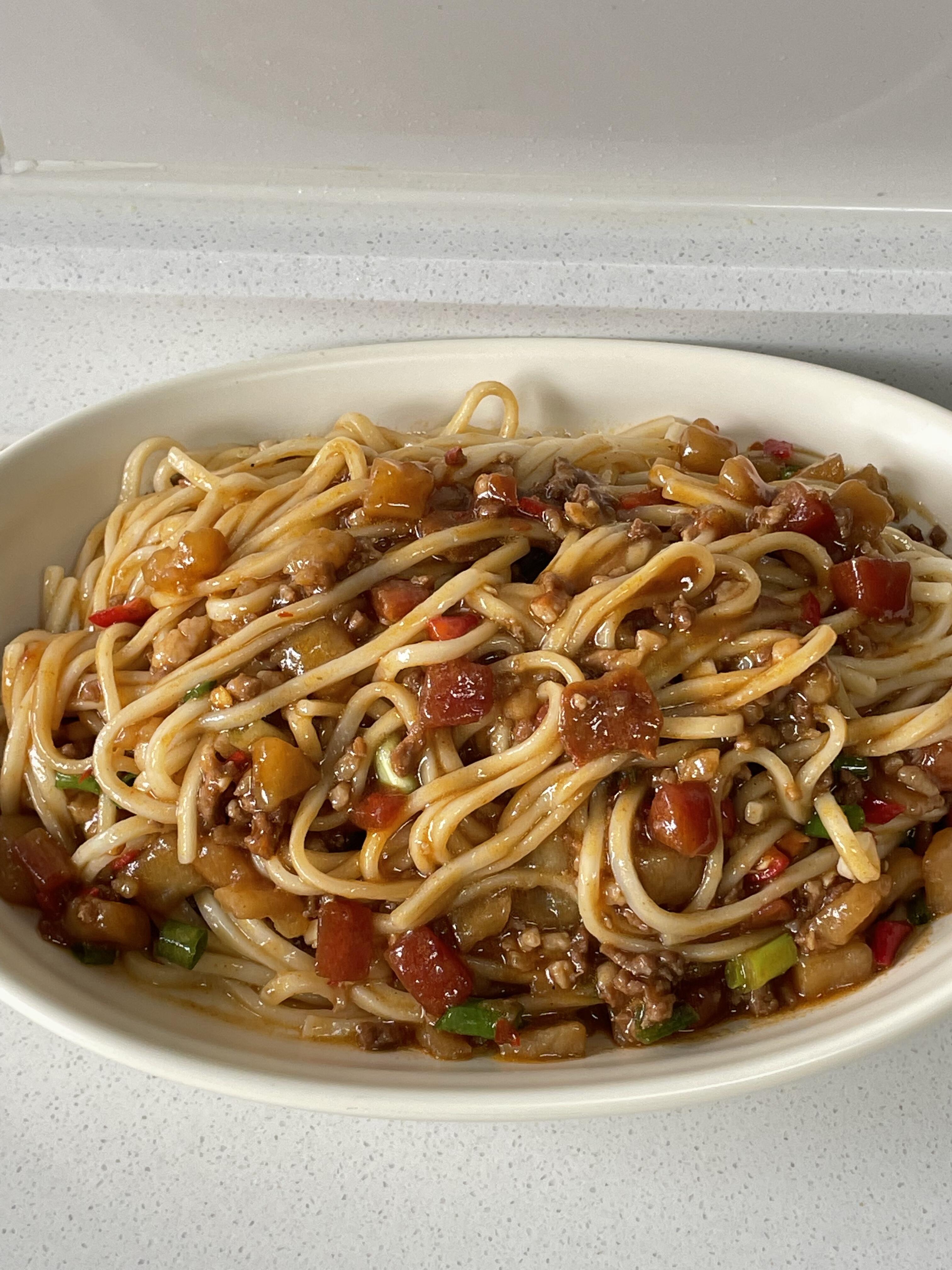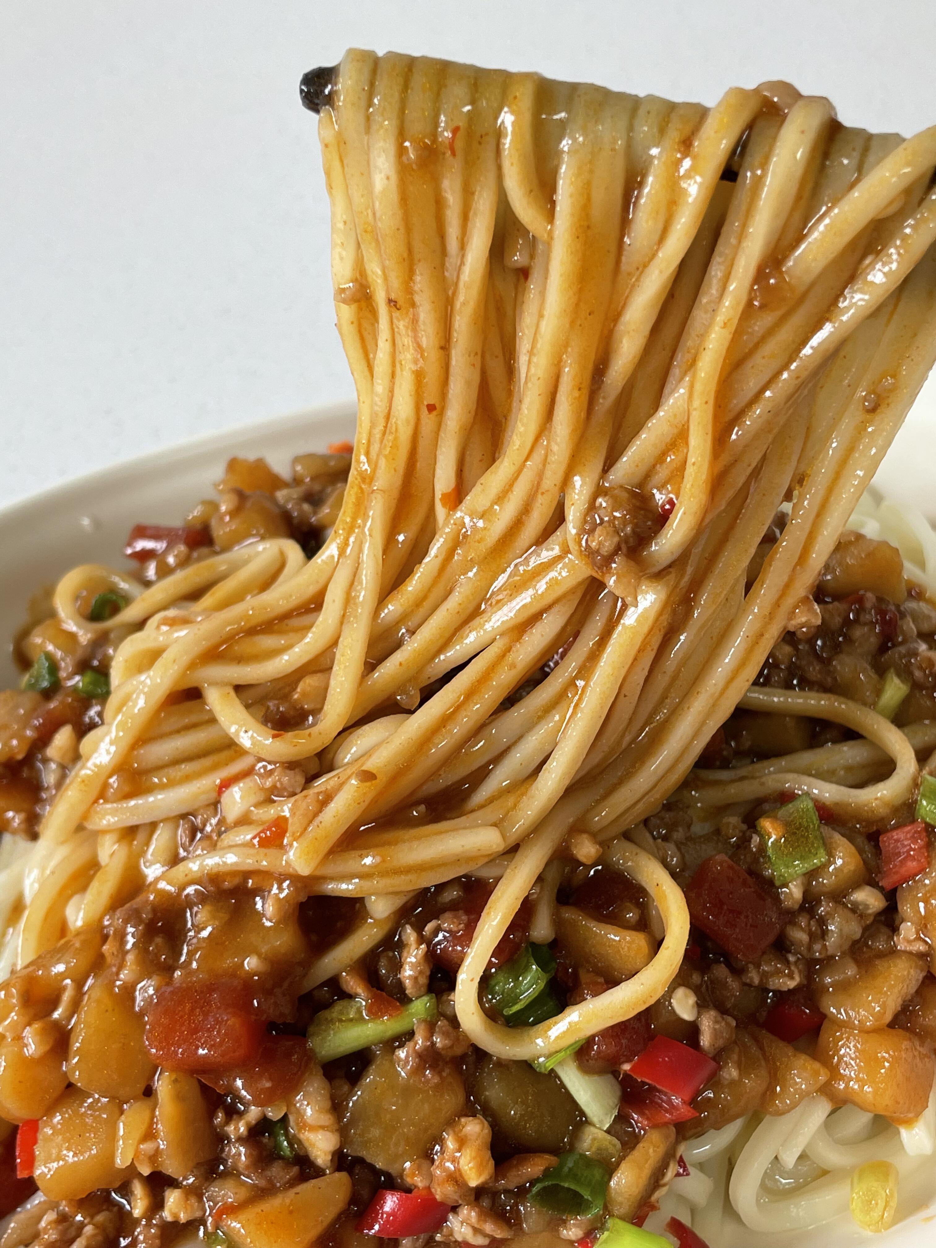 土豆丁炖得软糯绵密,吸满了肉酱的咸香,入口即化。 面条劲道爽滑,裹满了浓稠的酱汁,每一口都是碳水和酱香的完美碰撞, 简单质朴却好吃到停不下来,连炫三碗都不腻!