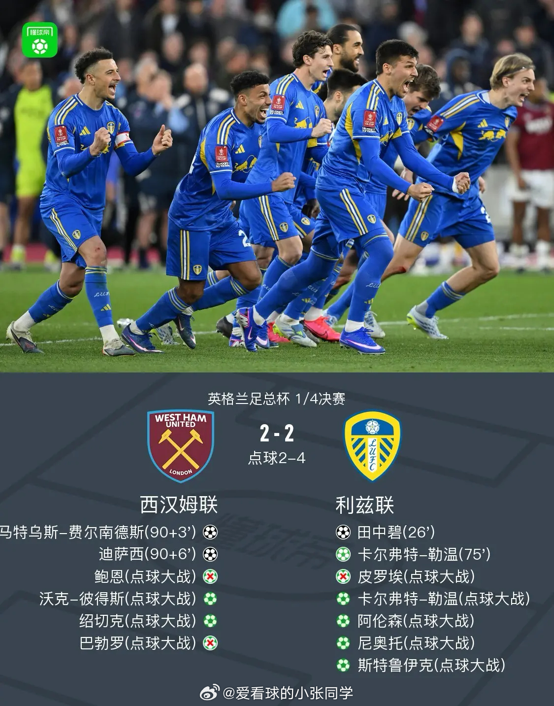 北京时间4月5日23:30,2025-2026赛季英格兰足总杯1/4决赛迎来压轴对决,英冠球队利兹联客场挑战英超劲旅西汉姆联,双方上演跌宕起伏的进球大战与点球决胜,最终利兹联以总比分6-4力克对手,斩获最后一张四强门票,时隔39年再度闯入足总杯半决赛。