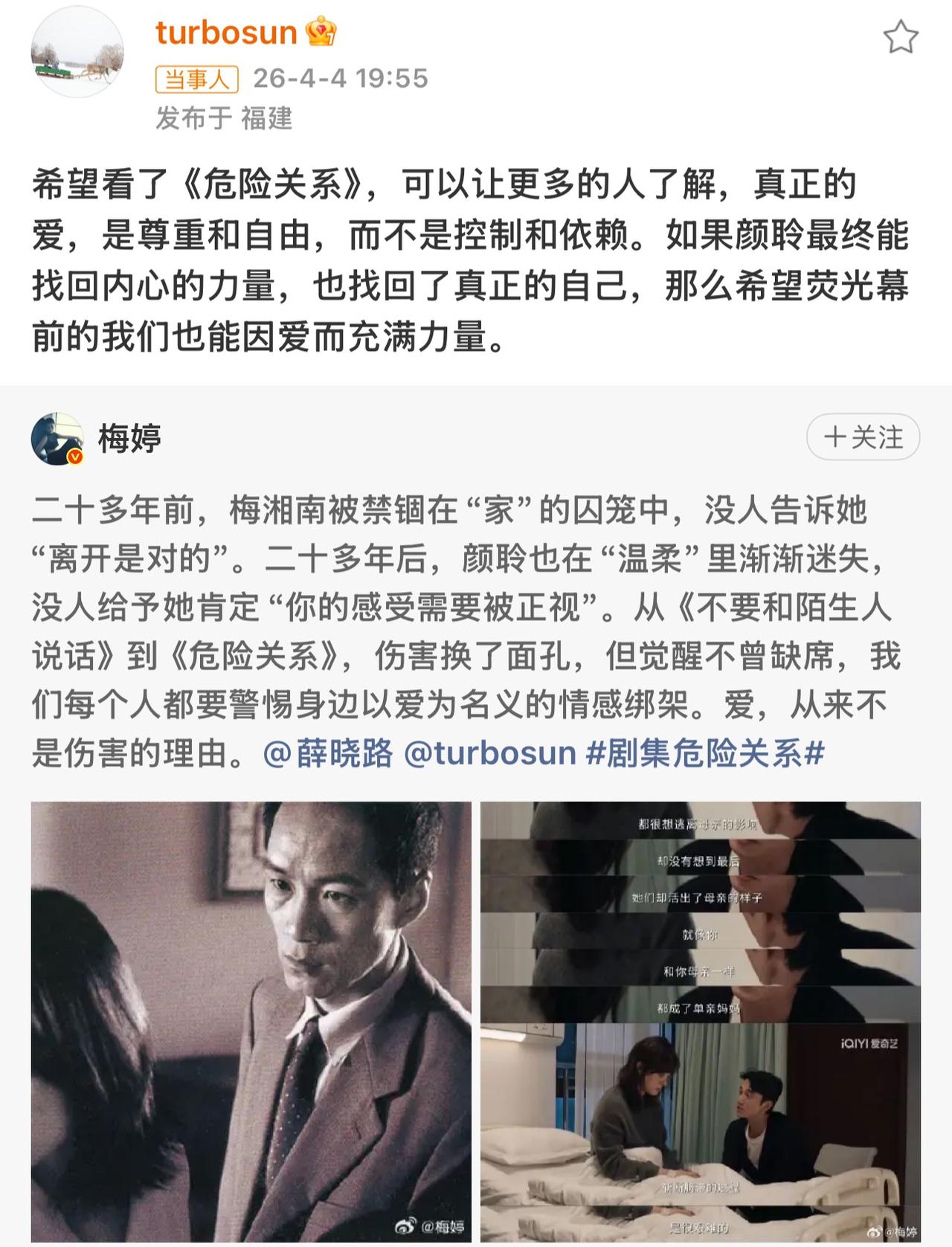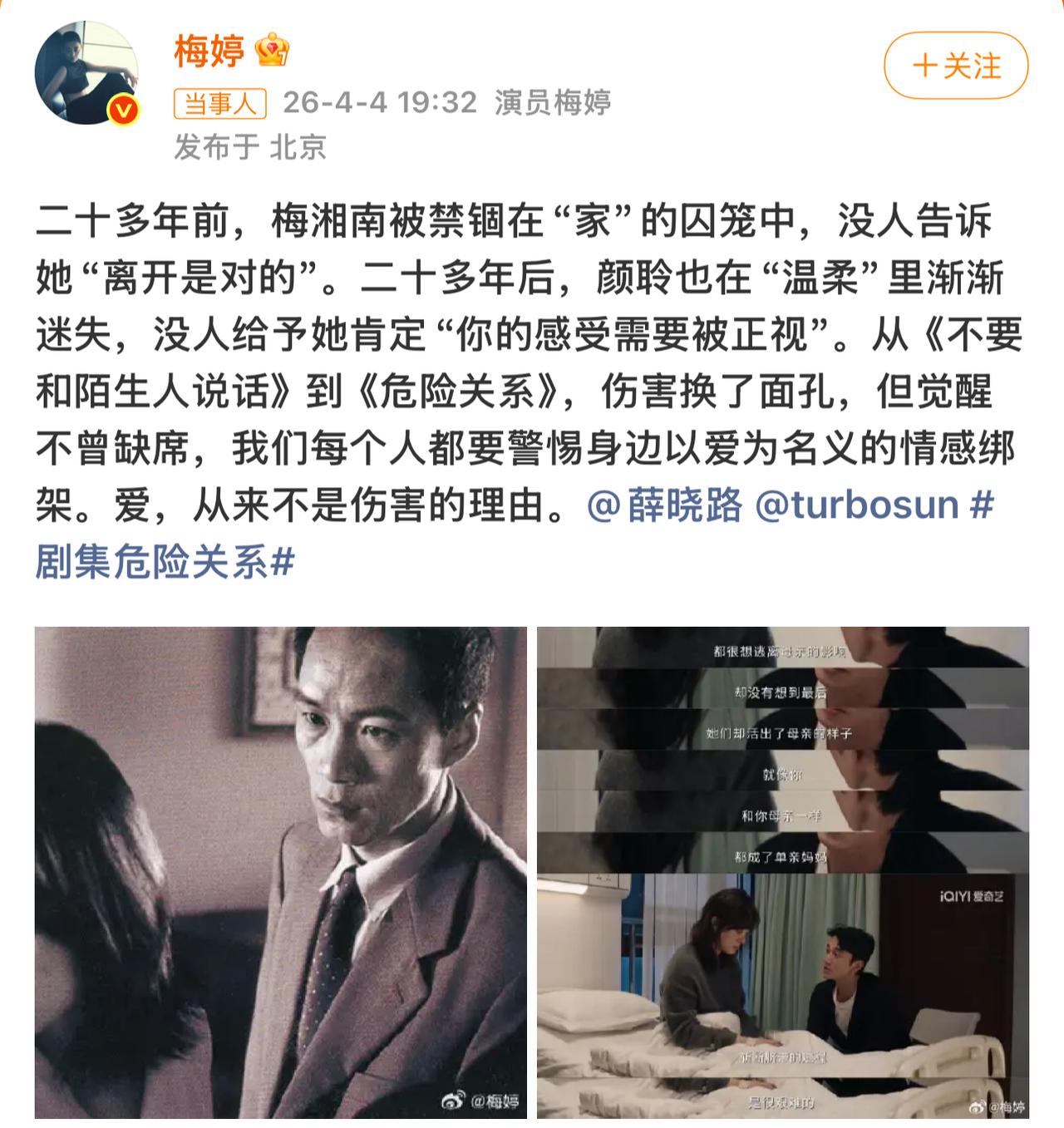 梅婷孙俪隔空对话,再谈家暴。 近日孙俪主演的《危险关系》热播。 那种让人窒息的感觉一下子就想到了《不要和陌生人说话》。 这两部剧都是一样的家庭牢笼。 梅婷发文谈家暴,孙俪直接微博转发并回应梅婷发文 一场梦幻联动,更让人警惕身边那些以爱为名义的情感绑架。