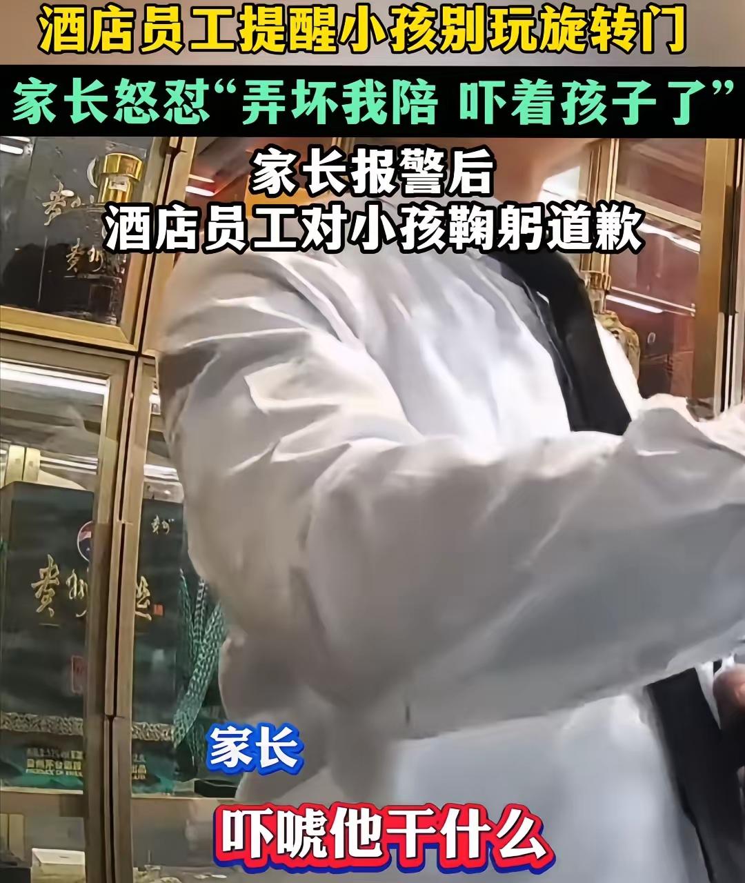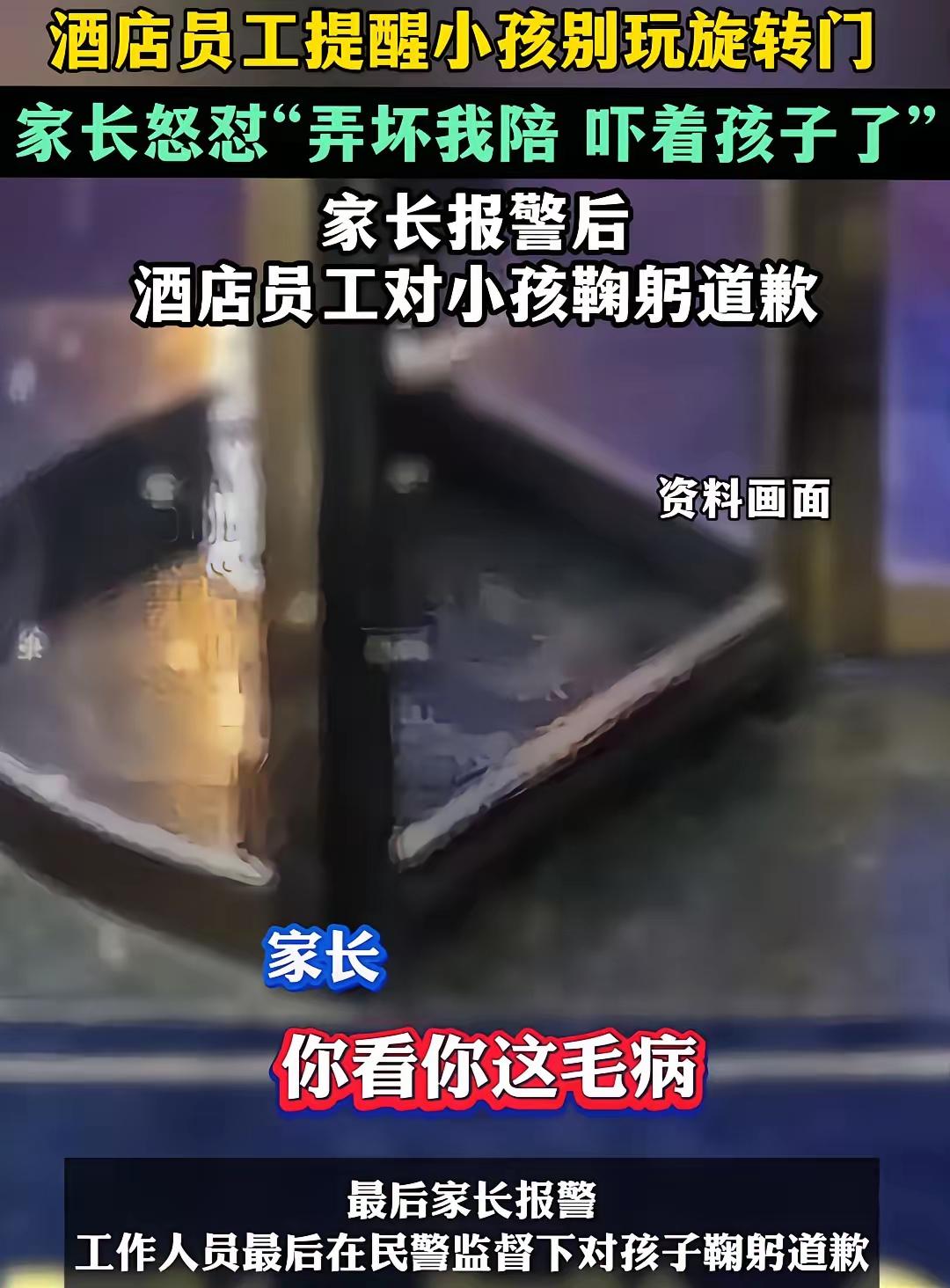 山东酒店员工善意提醒反被逼道歉,荒唐之举寒透人心 2026年4月4日山东酒店的一幕,荒唐至极。好心提醒避祸,反倒鞠躬致歉,这般是非颠倒之事,怎能不让全网震怒? (个人观点仅供参考,无任何不良引导) 酒店玻璃旋转门,本就是公共场所的安全雷区。门缝狭小锋利,门体转动力道十足。孩童手指娇嫩,稍有不慎便会遭遇夹伤惨剧。各地同类意外频发,隐患二字绝非空谈。 孩童在门旁追逐嬉闹,脚步踉跄险象环生。旁人见之无不揪心,生怕意外下一秒发生。酒店员工见状上前,语气温和出言提醒。无呵斥之言,无过激之举,全是护佑孩童的拳拳善意,尽是岗位职责的本分行事。 家长非但不领情,不自省看护失职,反倒胡搅蛮缠不依不饶。强行要求员工道歉,更在民警在场监督时,逼得员工无奈弯腰鞠躬。善举遭刁难,好心换委屈,天下哪有这般道理? 常言善有善报,此番善举却遭不公对待。家长护子本是天性,却护得毫无底线。无视安全隐患,苛责善意之人,如此家庭教育,怎育明理孩童? 小事见人心,细节显德行。善意从不该被肆意践踏,是非更不能被随意混淆。为人父母当守底线,懂感恩明事理,莫让无理之举寒了好心人热血,莫让荒唐之事凉了社会善意。守住是非边界,珍惜每份善意,才是处世正道。