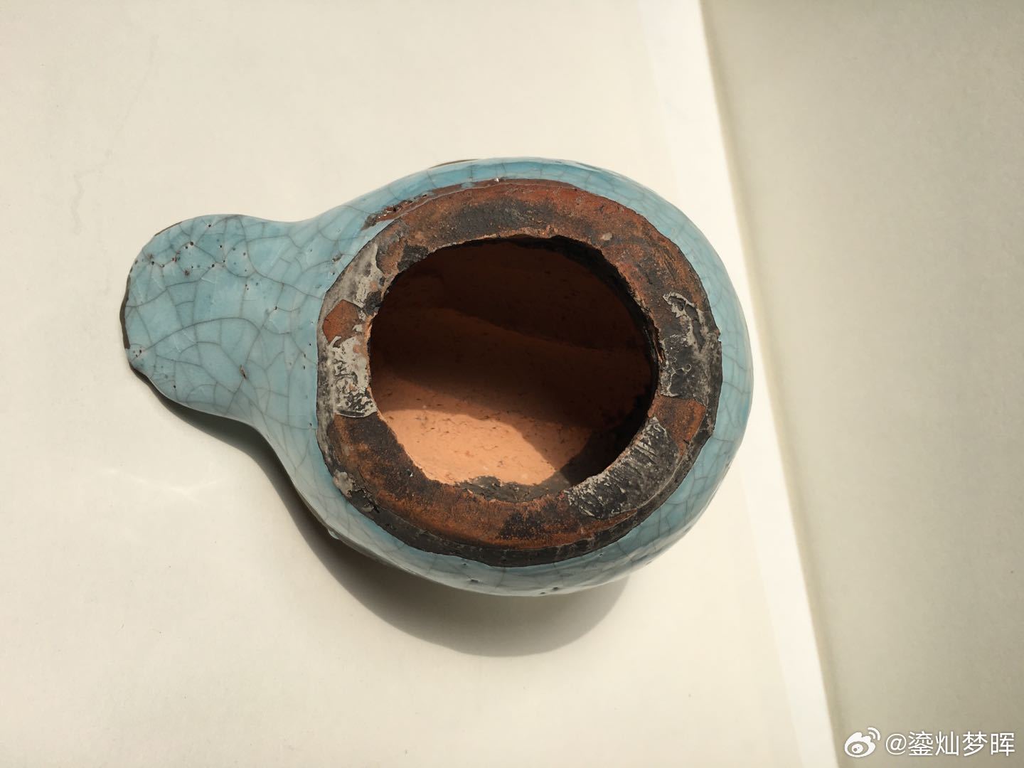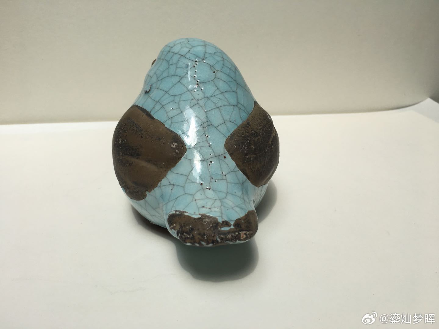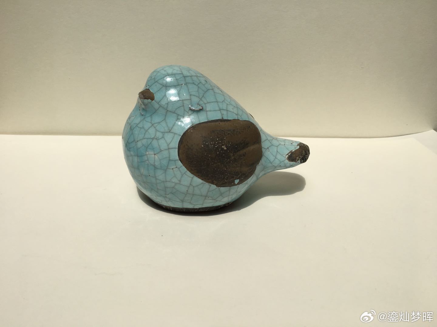 每周鉴赏收藏精品之北宋官窑天青釉塑鸟 北宋瓷器中的汝官不分,曾经困扰着清宫的乾隆爷,最终他以高高在上的姿态,不论是汝是官。而今科技发达的时代,总是想分清楚汝窑官窑。但这对民间收藏来说,谈何容易。 本件北宋瓷塑鸟,从天青釉色,蟹爪纹棕眼,开片三个方面看,是汝窑特征。但是,从艺术设计,烧造过程和胎土颜色来看,应该是北宋官窑。 艺术设计我们下一篇讨论。先看还原的烧造过程:素烧了鸟形的坯体,但左右两侧翅膀部位都开裂了。如果是汝窑的,窑工就会放弃了,这是毋庸置疑的。但是,本件不是这个结果。而是又从内膛补胎土,堵上裂缝,继续施釉,烧造成型。 这个过程,肯定经过一个再决策的环节。这就决定了它是北宋官窑,有一个窑工之外的人,决定做还是不做。 再看胎土颜色,两次用的胎土都是红胎土,肯定不是汝窑的灰、土、白三种颜色的胎土。也就是我们说的,汝窑工匠做的汝窑的釉、官窑的胎土。因此,也只能是北宋官窑瓷器了。 另外,从釉面光泽度来看,也比汝窑天青釉瓷器要明亮。 像本件瓷塑鸟,内膛部分毫无遮拦,相当于玉石开料的明料了。新老真假,一目了然。