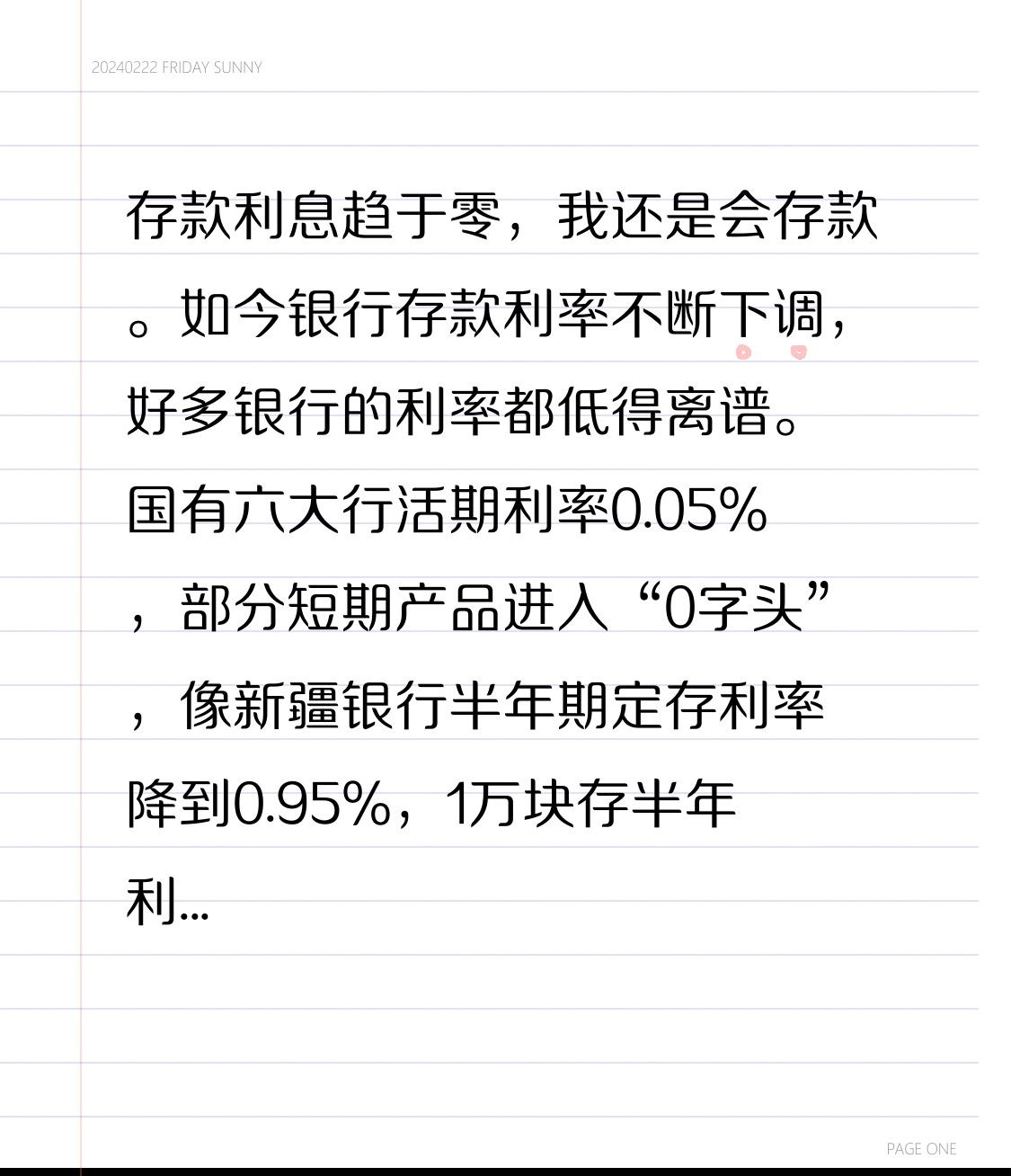 存款利息趋于零,我还是会存款。如今银行存款利率不断下调,好多银行的利率都低得离谱。国有六大行活期利率0.05%,部分短期产品进入“0字头”,像新疆银行半年期定存利率降到0.95%,1万块存半年利息才47块多。中长期的3年期、5年期也告别“2字头”。 但存款有它的好处,它能给我安全感,是应急金、养老钱、孩子教育金的保障。虽然利息少了,但能保本。我会把一部分钱存银行,再拿出一部分配置国债、货币基金等,用“安全打底、稳健为主、小额增值”的思路理财。