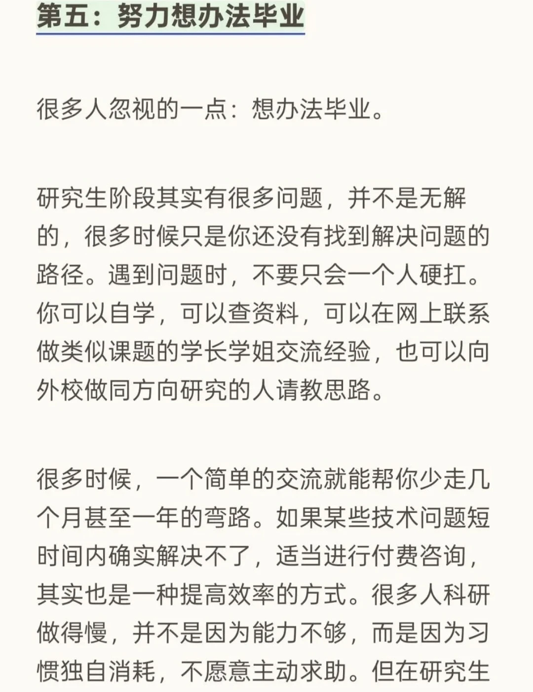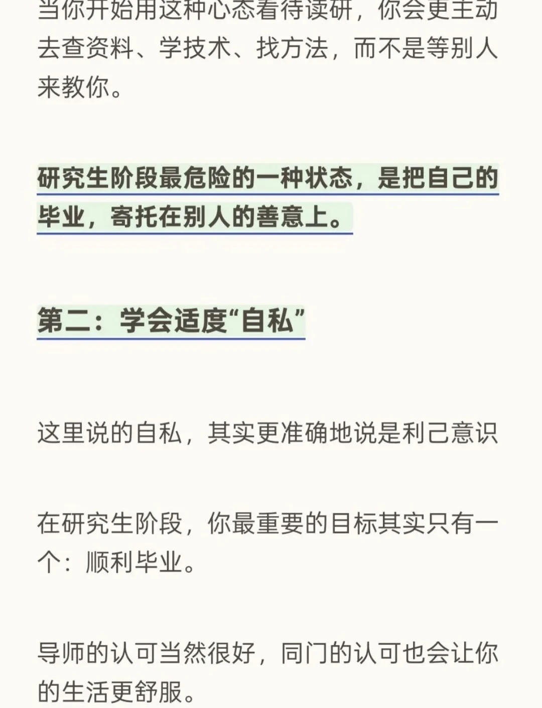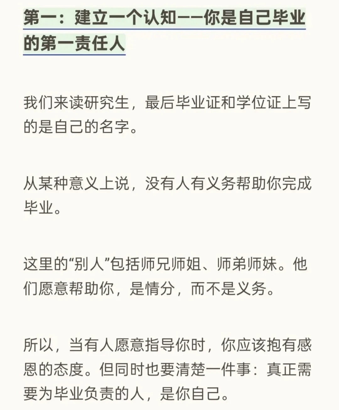 第一:建立一个认知—-你是自己毕业的第一责任人 我们来读研究生,最后毕业证和学位证上写的是自己的名字。 从某种意义上说,没有人有义务帮助你完成毕业。 这里的“别人”包括师兄师姐、师弟师妹。他们愿意帮助你,是情分,而不是义务。 所以,当有人愿意指导你时,你应该抱有感恩的态度。但同时也要清楚一件事:真正需要为毕业负责的人,是你自己。