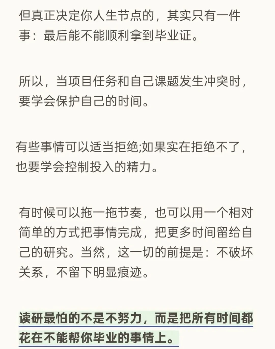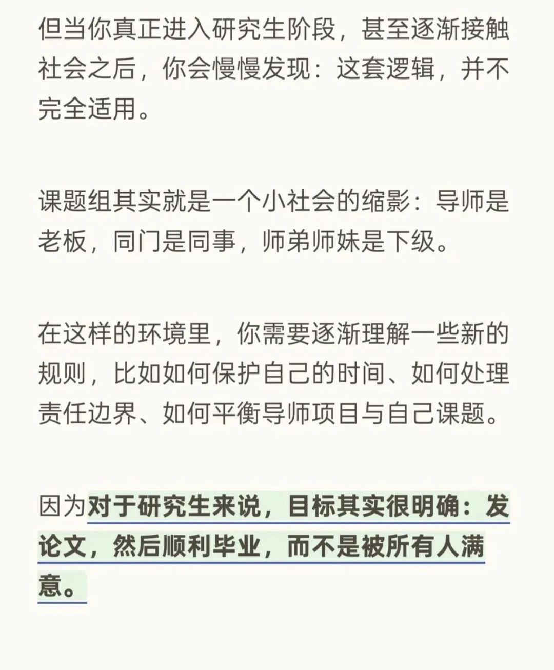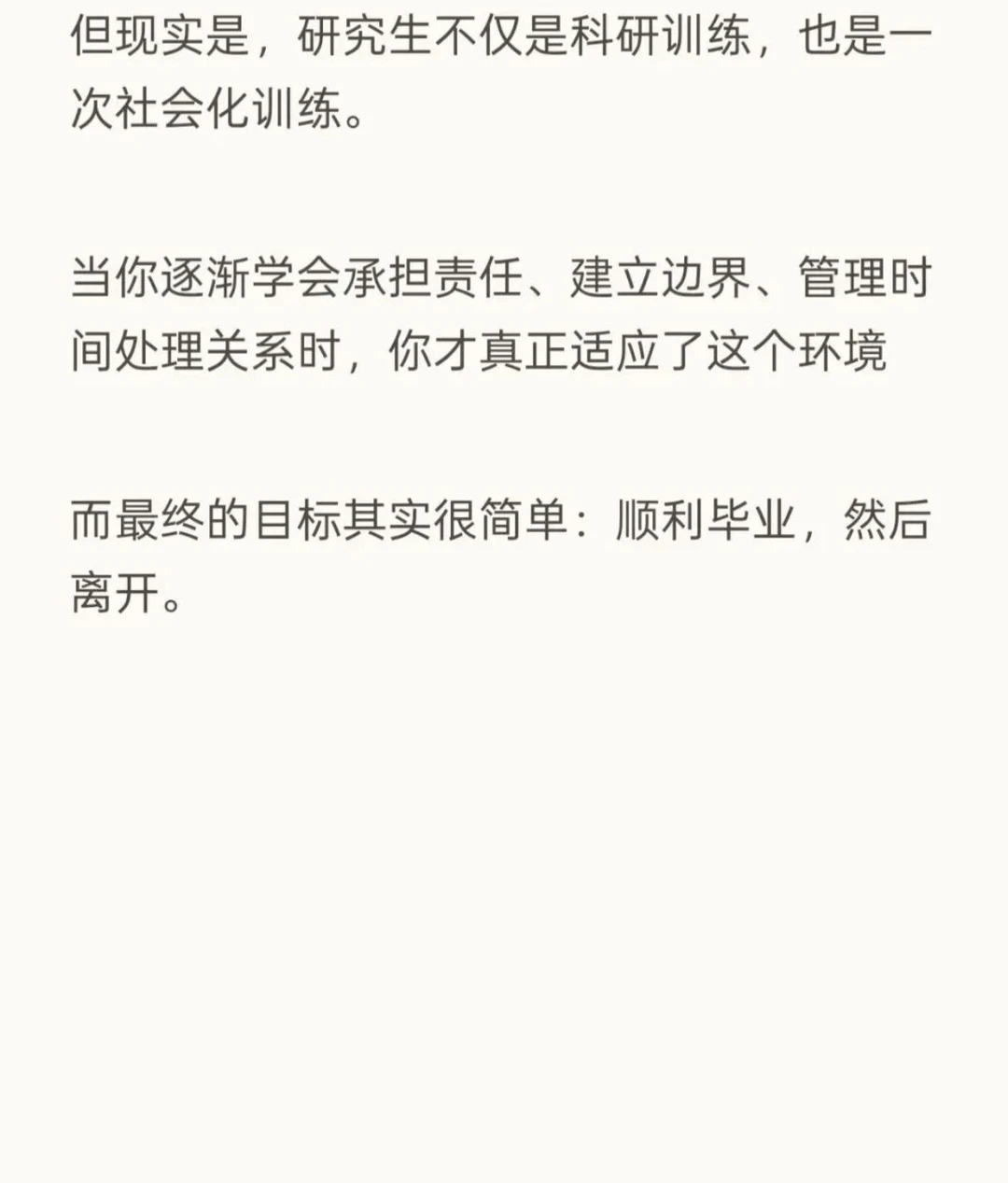 第一:建立一个认知—-你是自己毕业的第一责任人 我们来读研究生,最后毕业证和学位证上写的是自己的名字。 从某种意义上说,没有人有义务帮助你完成毕业。 这里的“别人”包括师兄师姐、师弟师妹。他们愿意帮助你,是情分,而不是义务。 所以,当有人愿意指导你时,你应该抱有感恩的态度。但同时也要清楚一件事:真正需要为毕业负责的人,是你自己。