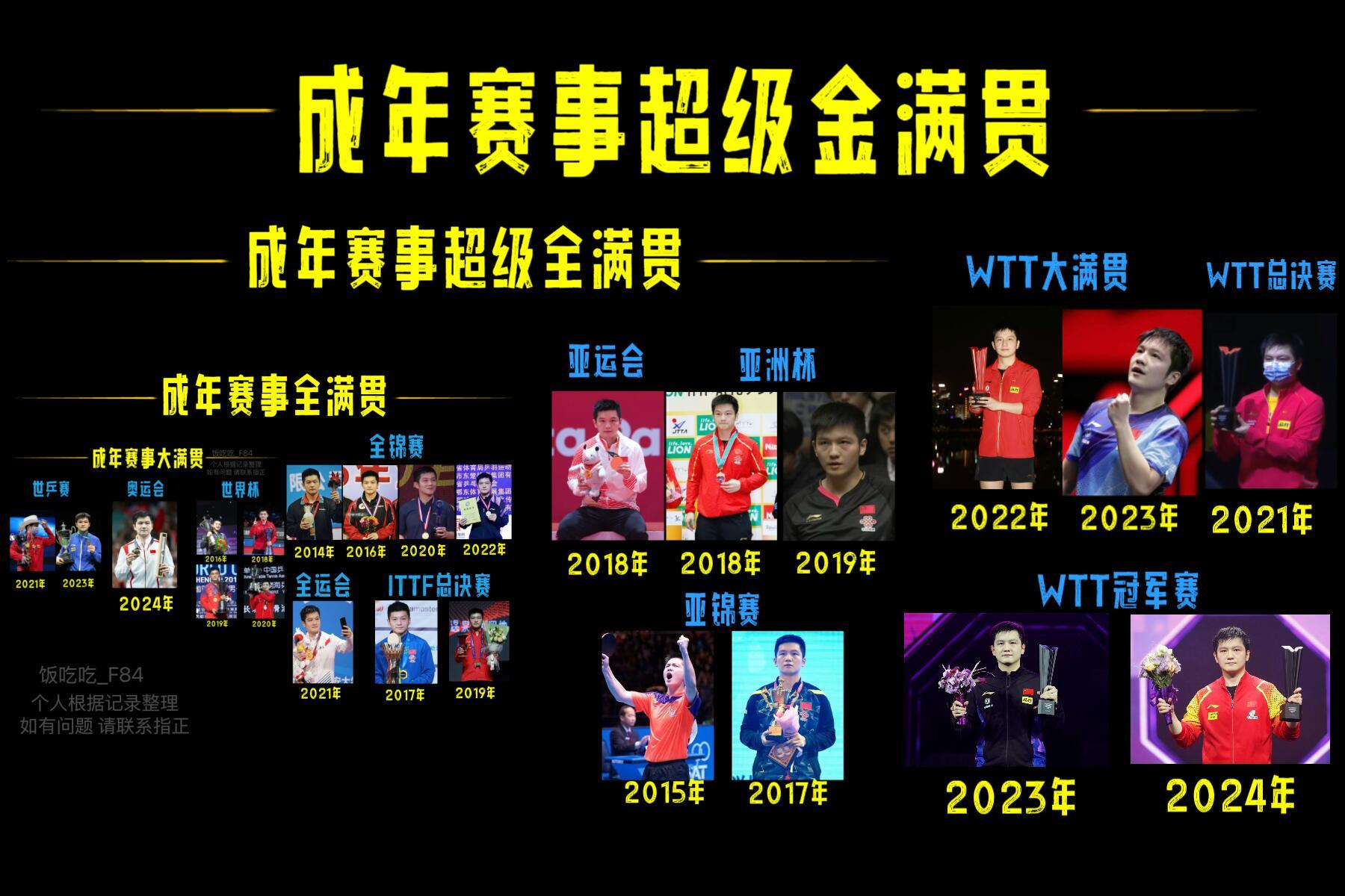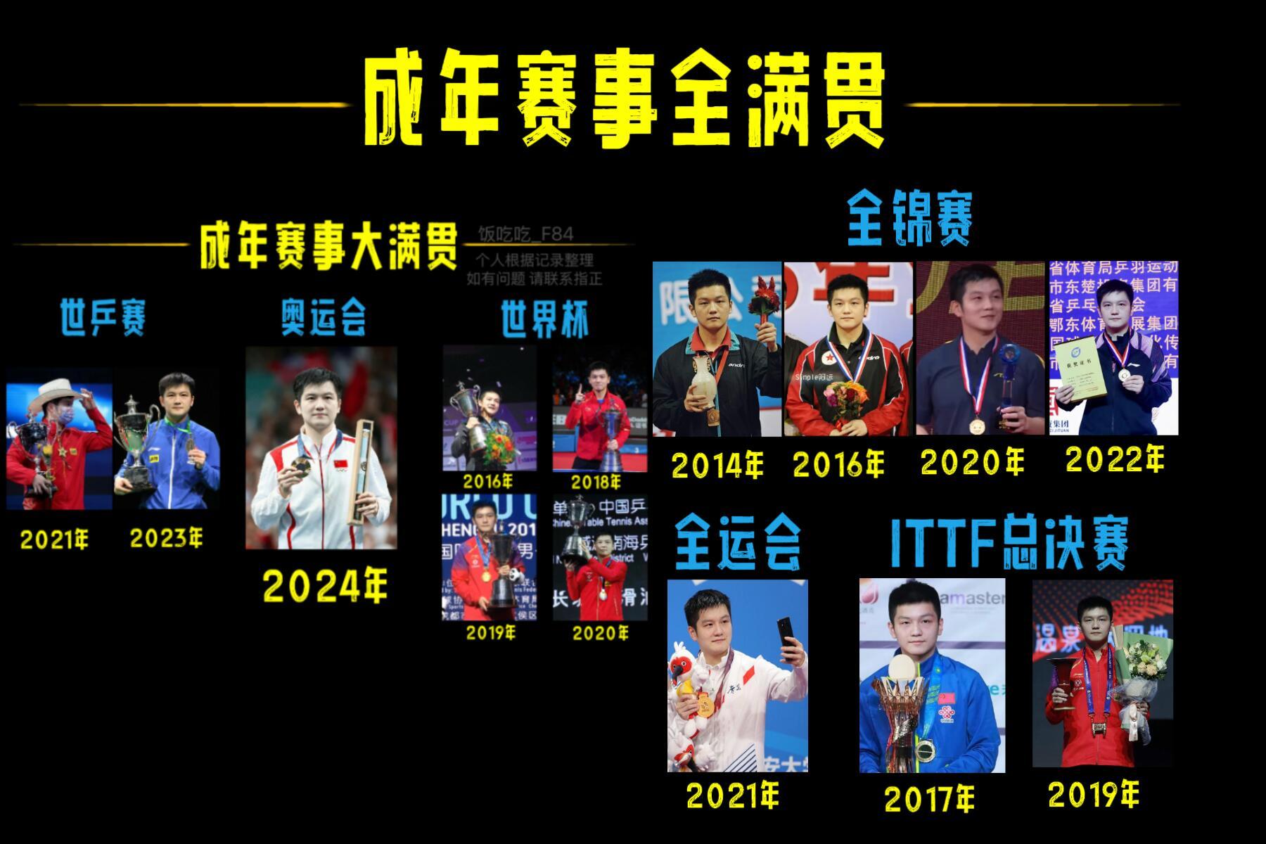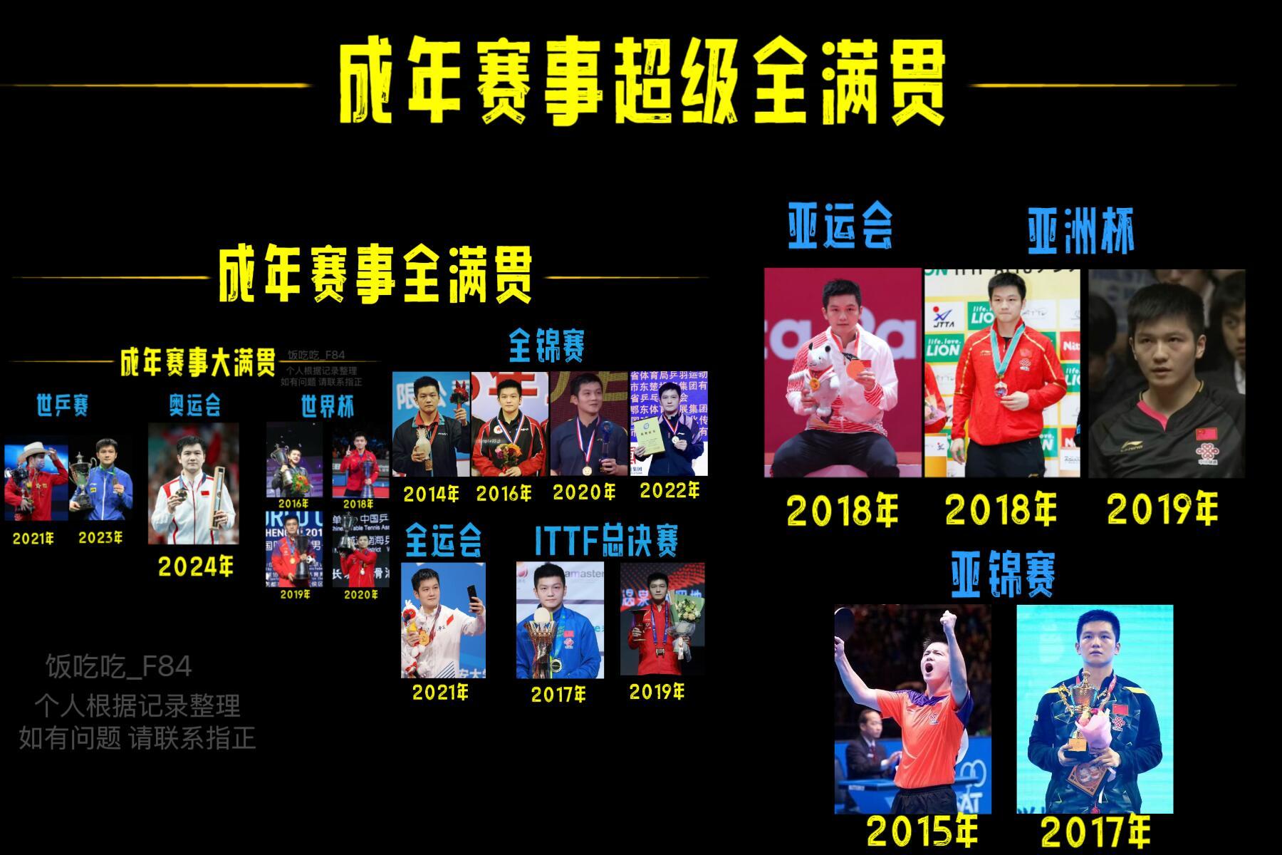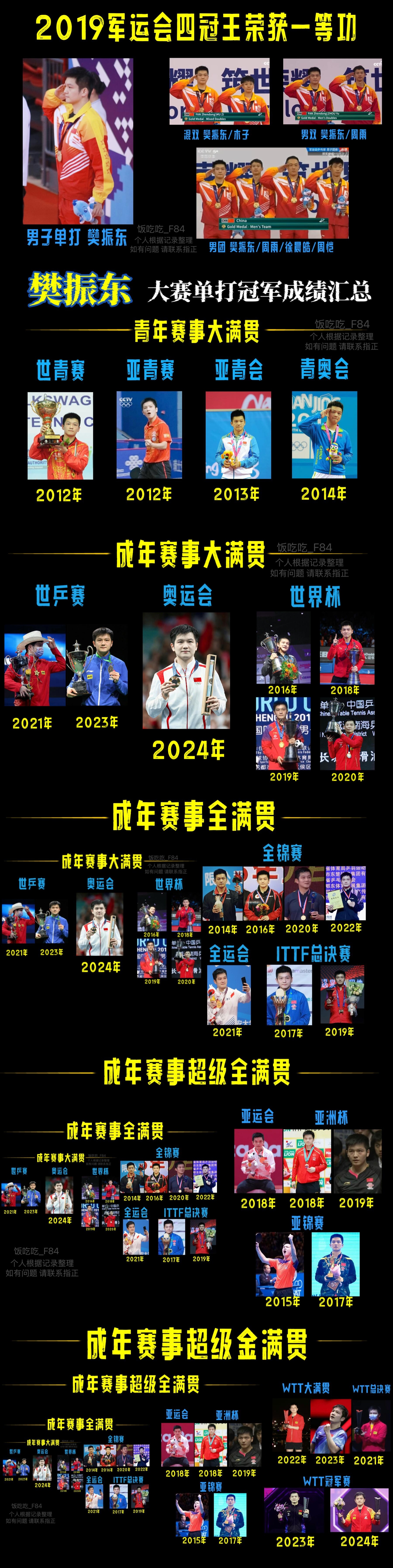 乒乓球界通关第一人:樊振东。 青年赛事大满贯:世青赛、亚青赛、亚青会、青奥会。 成年赛事大满贯:世乒赛、世界杯、奥运会。 成年赛事全满贯:成年赛事全满贯+全锦赛、全运会ITTF总决赛。 成年赛事超级全满贯:成年赛事全满贯+亚运会、亚洲杯、亚锦赛。 成年赛事超级金满贯:成年赛事超级全满贯+WTT大满贯、WTT总决赛、WTT冠军赛。 樊振东无上荣誉:军运会四冠王荣获一等功