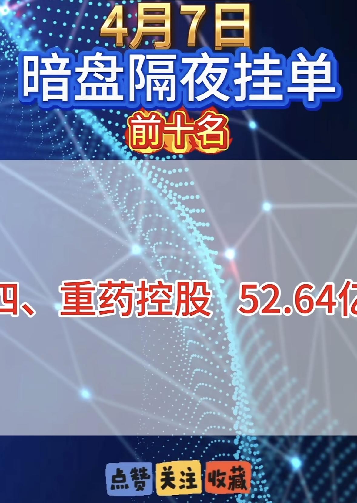 4月7日周二暗盘隔夜挂单排行榜出炉 4月7日暗盘隔夜挂单榜前10名揭晓,这可太让人兴奋了!清明节点向来是A股的关键博弈期。很多散户总被主力资金弄得晕头转向,追高被套、低位割肉是常有的事。其实节前的隔夜大额挂单就是资金情绪的风向标。 4月7日,有6只个股出现大规模隔夜挂单,涉及农业、医药等热门赛道,挂单金额从32.9亿到121.6亿不等,累计超370亿。就像4月1日,暗盘超大单集中抢筹,商业航天、绿电等四大主线爆发,前8股合计挂单超600亿。这暗盘挂单里藏着不少主力的心思,值得好好研究!