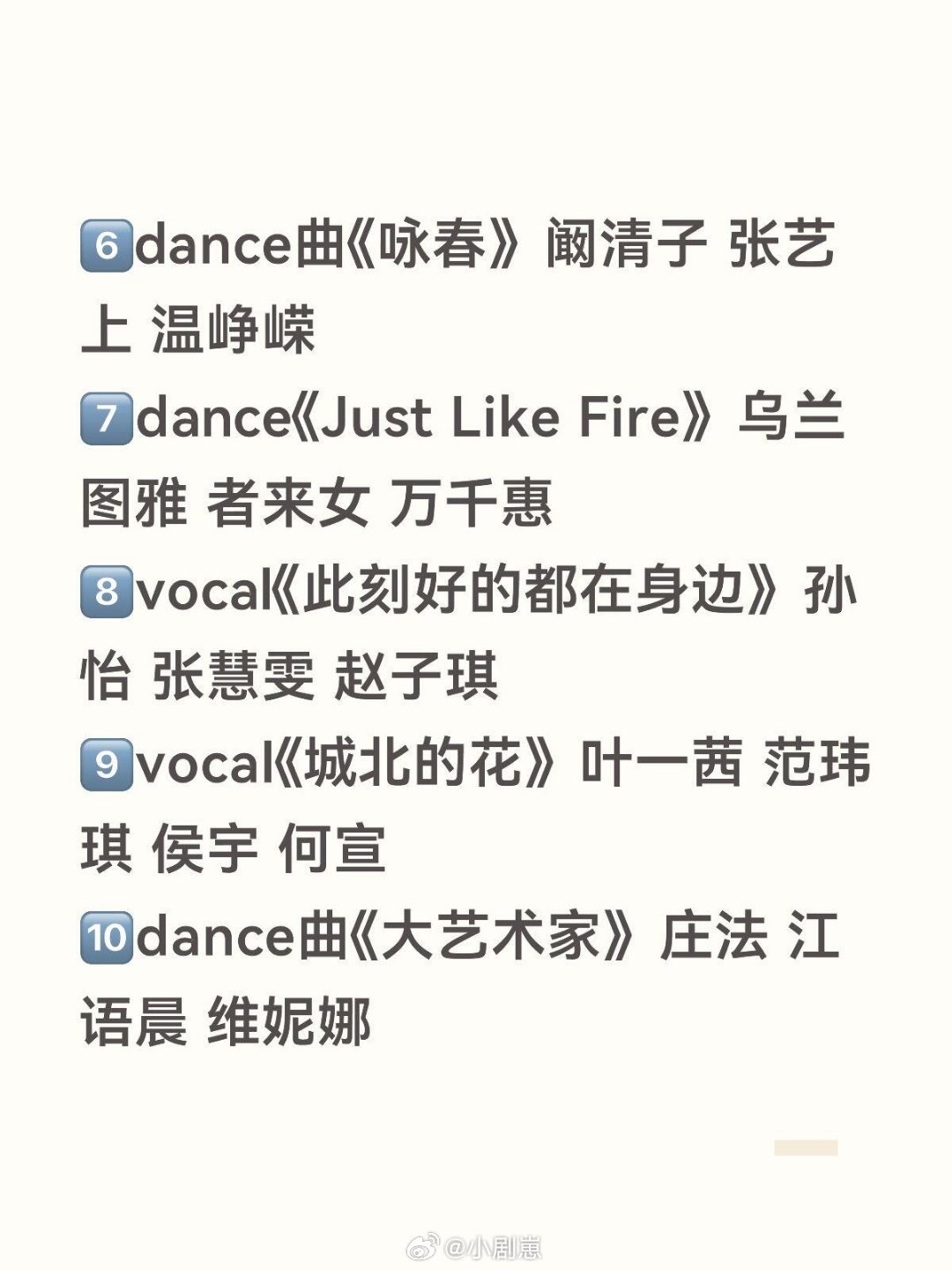 【乘风一公组队选曲】感觉可以直接预测了..我最期待的是...张月组 李小冉组 李心洁组 曾沛慈组有点子期待很不一样说不定炸出更黑马的——萧蔷组 乌兰图雅组 孙怡组 叶一茜组 庄法组【一共10个组7首dance曲3vocal曲】1. dance曲《彩虹的微笑》:萧蔷‖安崎‖陶昕然2. dance曲《心愿便利贴》:李小冉‖唐艺昕‖王濛3. dance曲《霍元甲》:张月‖陈瑶‖徐梦洁‖代斯4. vocal曲《雨爱》:李心洁‖谢楠‖陈凯琳‖徐洁儿5. dance曲《一半一半》:曾沛慈‖淡淡‖黄灿灿6. dance曲《咏春》:阚清子‖张艺上‖温峥嵘7. dance《Just Like Fire》:乌兰图雅‖者来女‖万千惠8. vocal《此刻好的都在身边》:孙怡‖张慧雯‖赵子琪9. vocal《城北的花》:叶一茜‖范玮琪‖侯宇‖何宣林