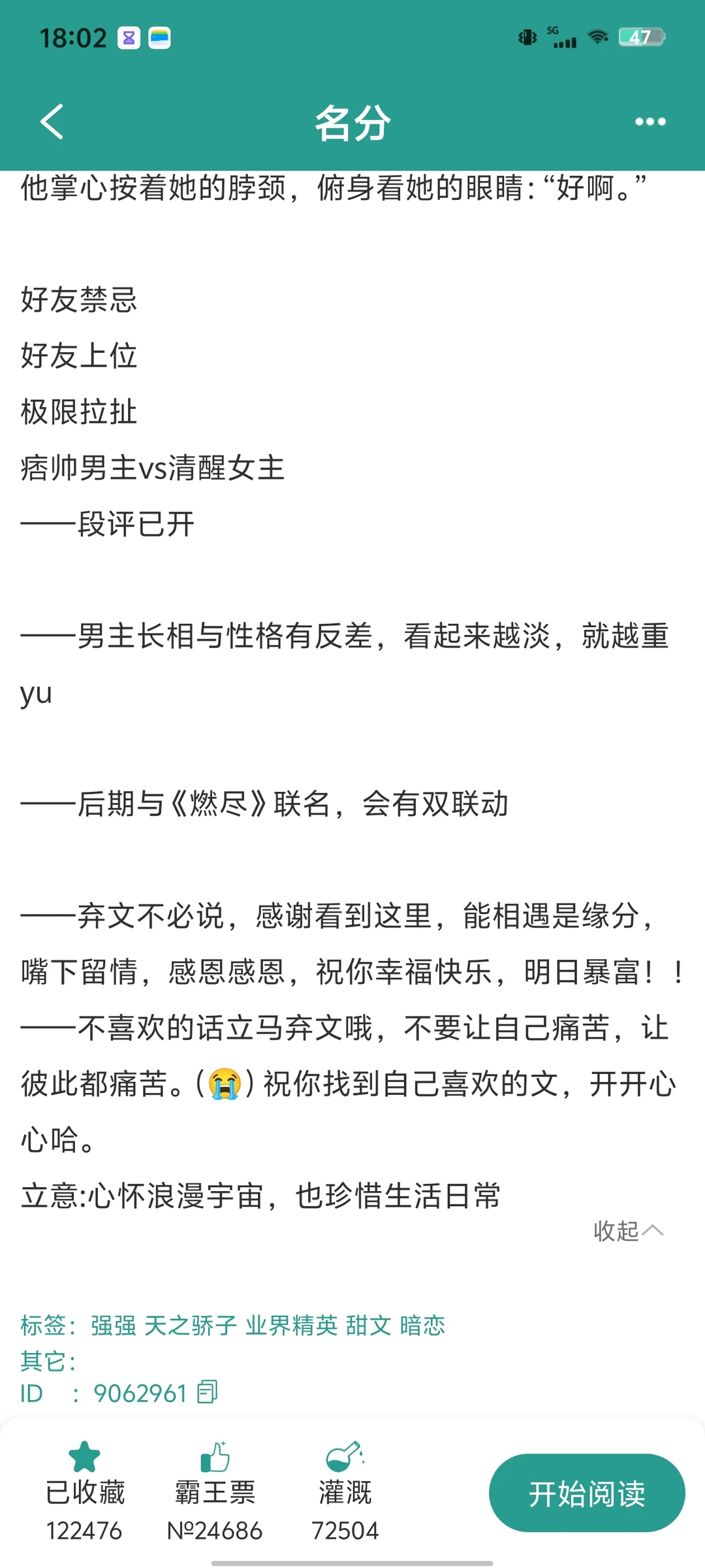 《名分》by半截白菜 刚完结的文,一共95章 暧昧试探,好友变爱人 温柔老板娘vs冷傲富二代 暗恋,暧昧拉扯,好友禁忌! [郁金香R]女主和男主是高中同学,暗恋他很多年。男主和女二是发小,高中毕业时女二出国。朋友包括女主都觉得男主在等着女二,他俩默认是一对,其实男主喜欢的是女主。 [绿色心形R]女主本来都要答应和相亲对象在一起了,男主又跑出来插一脚,直球出击,俩人终于坦诚爱意,甜甜蜜蜜。男主装得高冷,实则每次女主和其他异性接触,表面不动声色,内心已经要气疯了,拼命刷存在感!