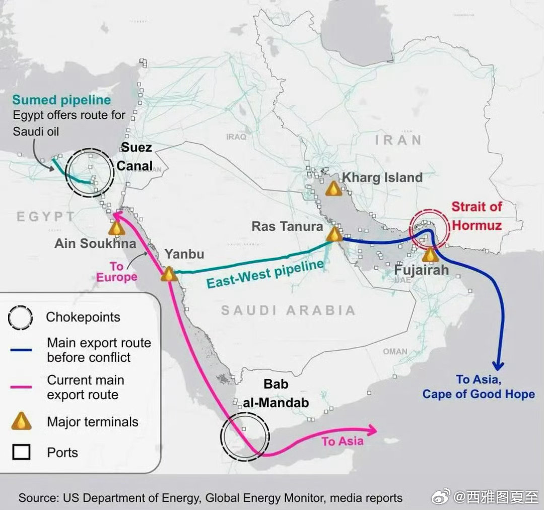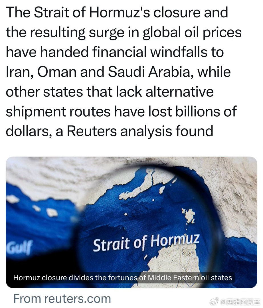 目前的局势,除了让伊朗本身,比战前石油收入更高,还有两个国家受益:沙特和阿曼~都是有输油管道绕过海峡