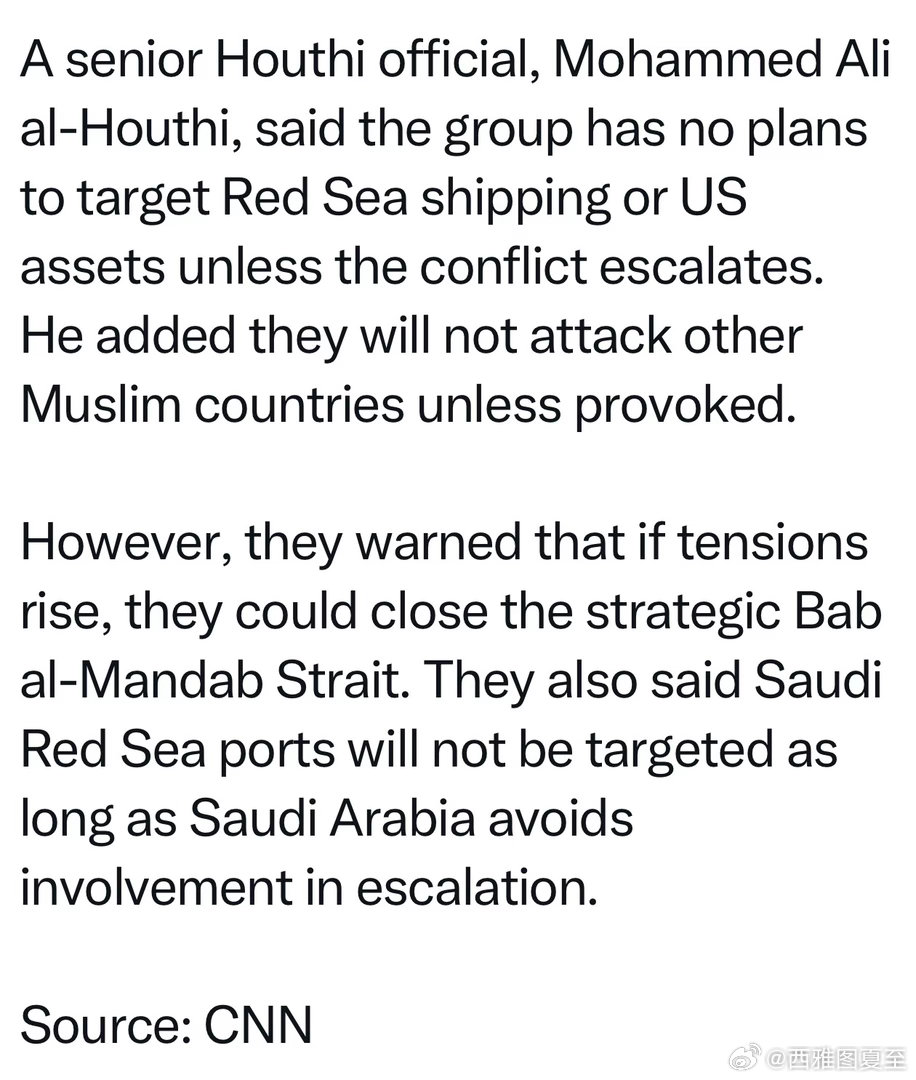 也门胡塞武装声明:不会袭击红海航道,除非冲突升级;不会针对沙特在红海沿岸的港口,除非沙特参与升级
