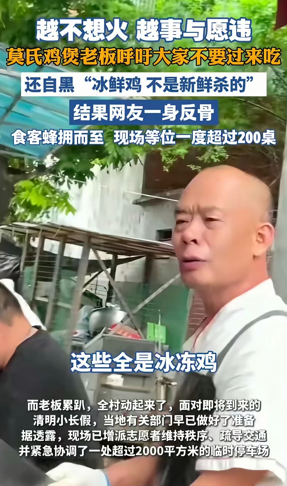 近日,佛山顺德陈村镇的莫氏鸡煲凭借地道风味意外爆红网络,随之而来的“店家遭当地文旅部门施压,被迫放弃休息开门营业”的传言也迅速发酵。4月6日,当地相关部门负责人回应称,网传文旅施压一事完全不属实,店铺持续营业,是老板“老莫”自己宠粉,不忍让远道而来的食客失望。莫氏鸡煲被传遭文旅施压开门营业时事满谈在网红餐饮遍地营销、争相造势的当下,广东顺德陈村镇一家不起眼的莫氏鸡煲,却靠着截然不同的“反向操作”意外爆红。这家小店的走红,没有精心策划的营销套路,没有华丽的门店包装,源于美食探店博主的偶然打卡,全凭老板一句句直白的反向劝退,成为全网皆知的网红店,加之鸡煲味道地道、鲜美,吸引了更多打卡食客。为了抗拒爆火,莫叔甚至使出了更多“劝退招数”,不仅口头劝退、贴标语提醒,还悄悄开小号给自己家店刷差评,自黑用的是冻鸡、味道普通,想尽办法让网友打消打卡的念头,却让小店的热度持续飙升。