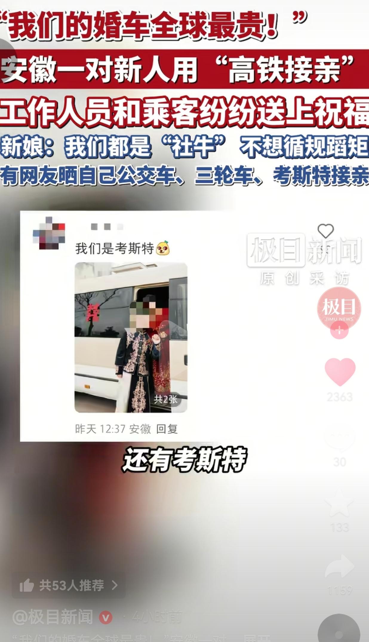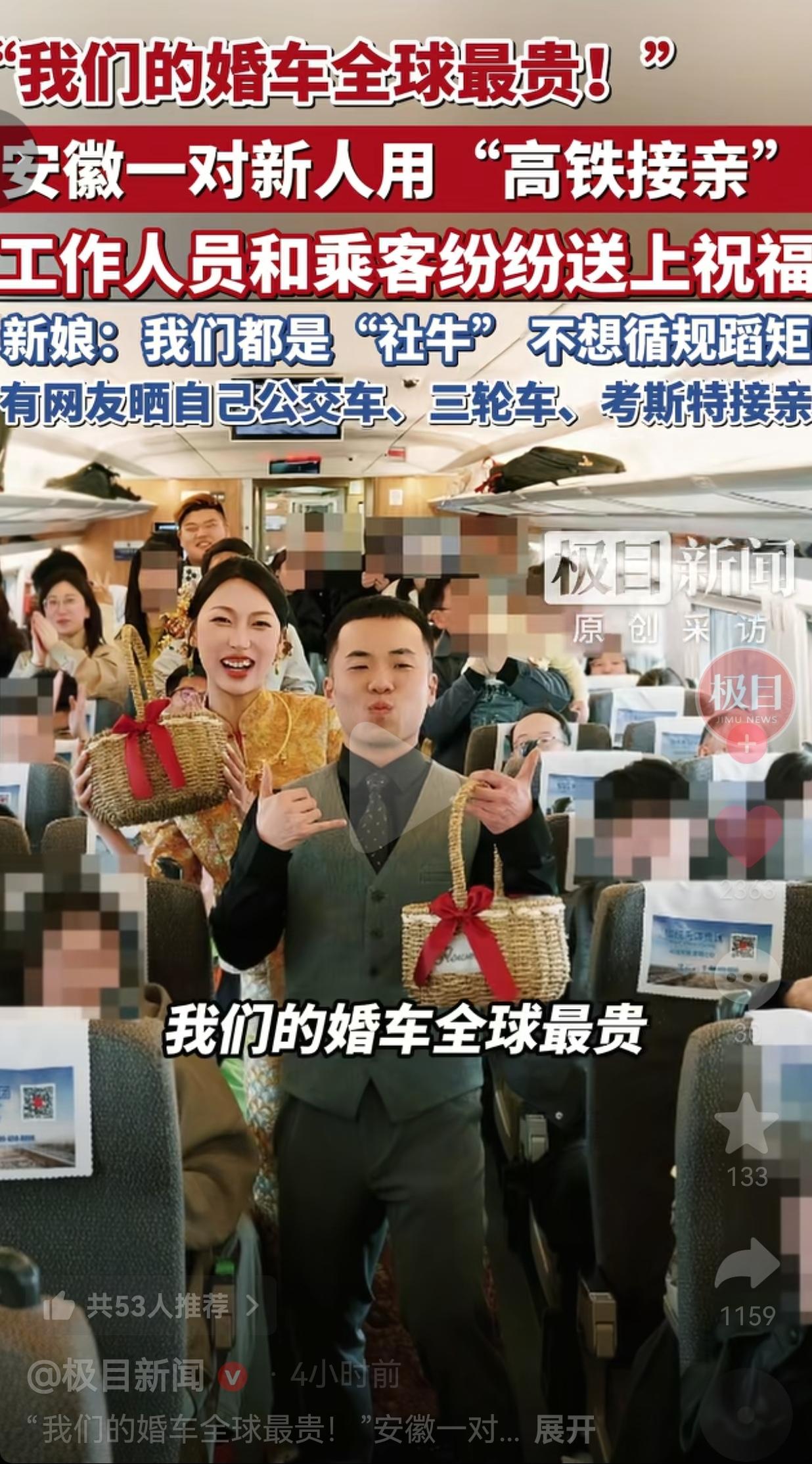 安徽这对新人高铁接亲火了!“别人结婚用豪车接亲,他俩直接把高铁当婚车,拎着两大篮